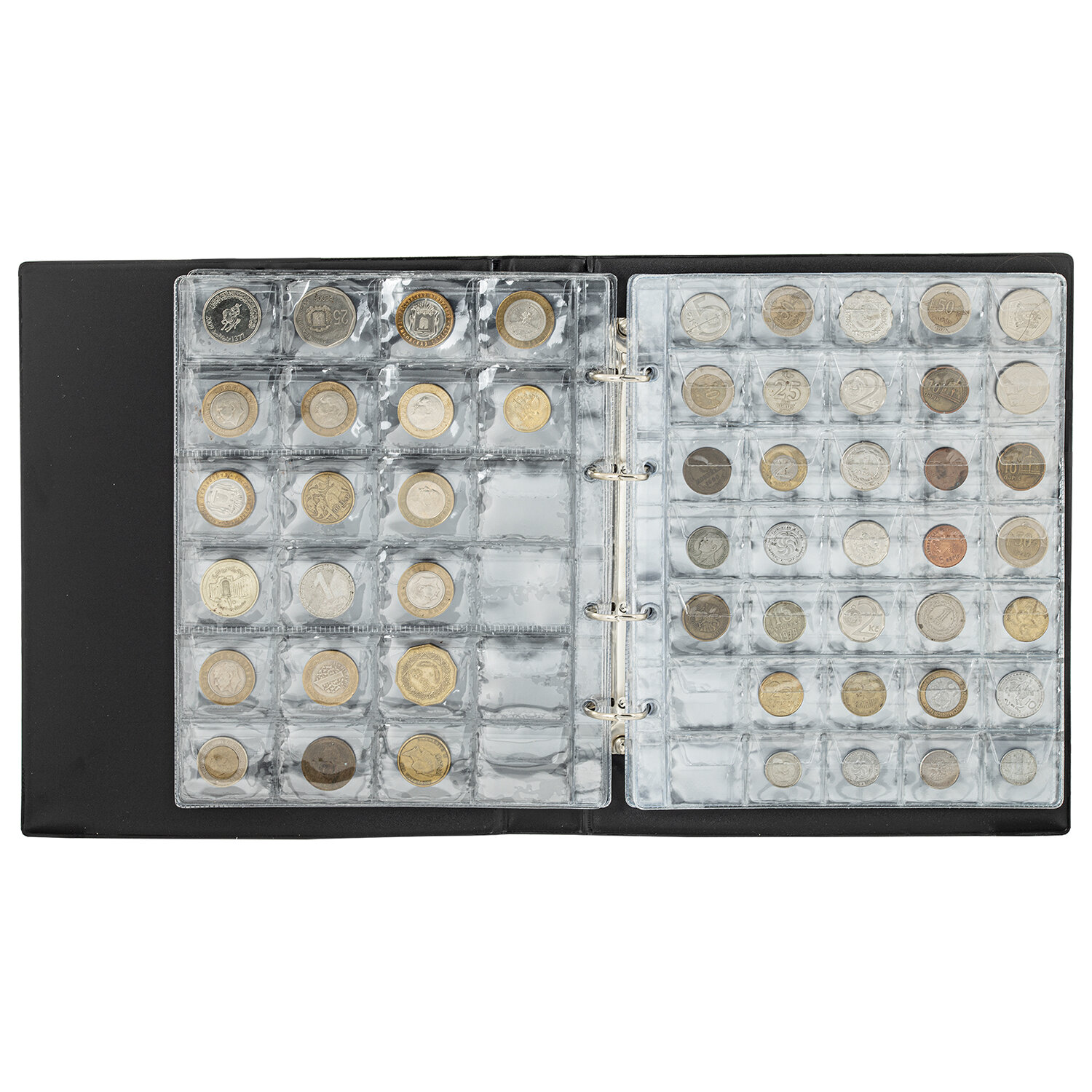 Альбом размером 230х270 мм выполнен из качественного ПВХ и представлен в коричневом цвете. Укомплектован 3-мя листами по 48 ячеек (размер ячейки 28х28 мм), 3-мя листами по 35 ячеек (размер ячейки 35х35 мм), 2-мя листами по 24 ячейки (размер ячейки 44х40 мм), 2-мя листами для бон (купюр) по 3 ячейки (размер ячейки 185х80 мм). Материал листов - ПВХ. Альбом вмещает 297 монет и 6 бон (купюр). Альбом нумизмата для 297 монет и 6 бон (купюр) "OPTIMA", 230х270 мм, ПВХ, коричневый, STAFF, 238077