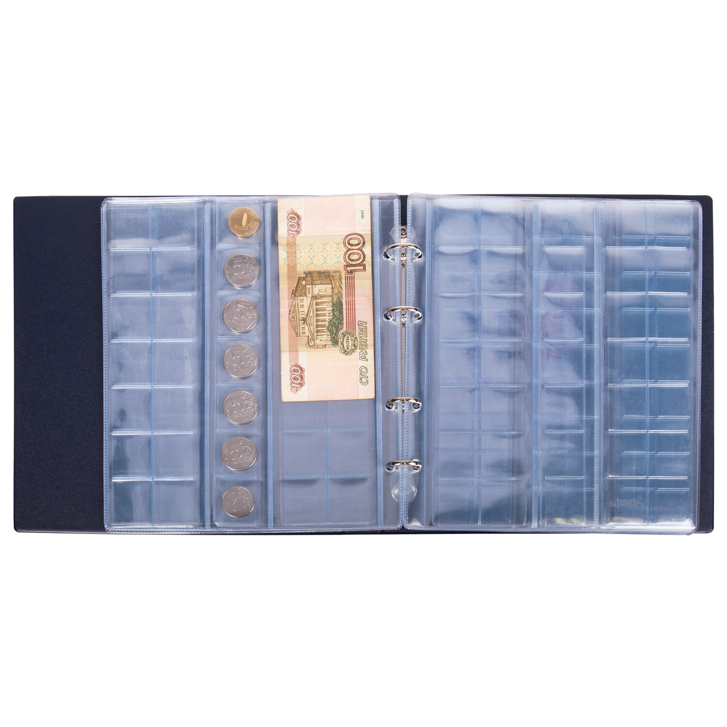 Альбом размером 253х238 мм выполнен из качественного кожзама и представлен в синем цвете. Укомплектован девятью листами-вкладышами с выдвижными карманами: 4 листа с карманами размером 23х26 мм (216 шт.), 4 листа с карманами размером 28х34 мм (140 шт.) и 1 лист с карманами размером 37х40 мм (24 шт.). Итого альбом вмещает 380 монет диаметром до 38 мм. Также возможно вертикальное расположение купюр в карманах альбома. Материал листов - ПВХ. Альбом нумизмата для 380 монет (диаметр до 38 мм) и купюр, 253х238 мм, синий, ОСТРОВ СОКРОВИЩ, 237960