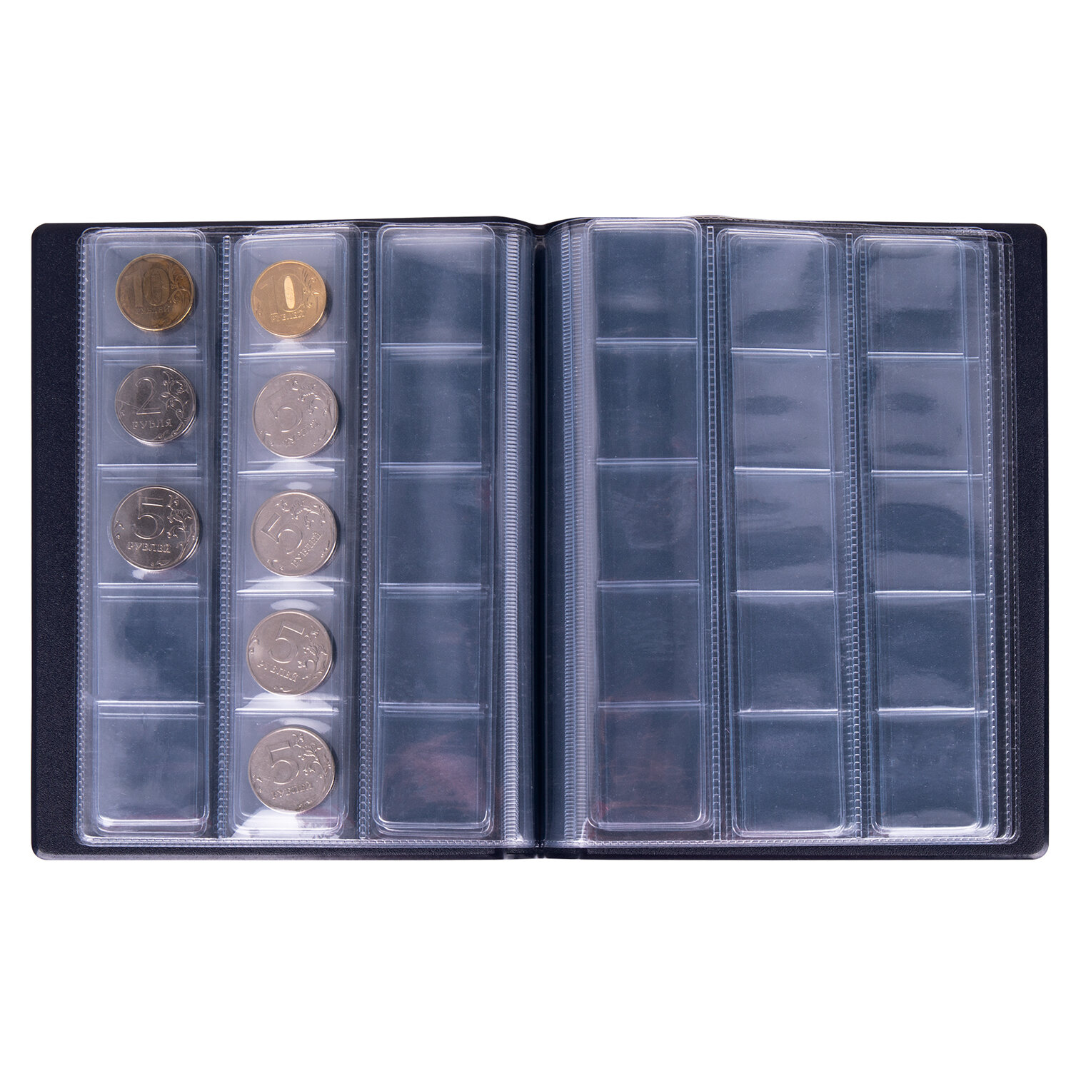 Альбом размером 145х185 мм выполнен из качественного кожзама и представлен в синем цвете. Укомплектован шестью листами-вкладышами с выдвижными карманами. Альбом вмещает 90 монет диаметром до 32 мм. Размер карманов - 30х33 мм, материал листов - ПВХ. Альбом нумизмата для 90 монет (диаметр до 32 мм), 145х185 мм, синий, ОСТРОВ СОКРОВИЩ, 237958