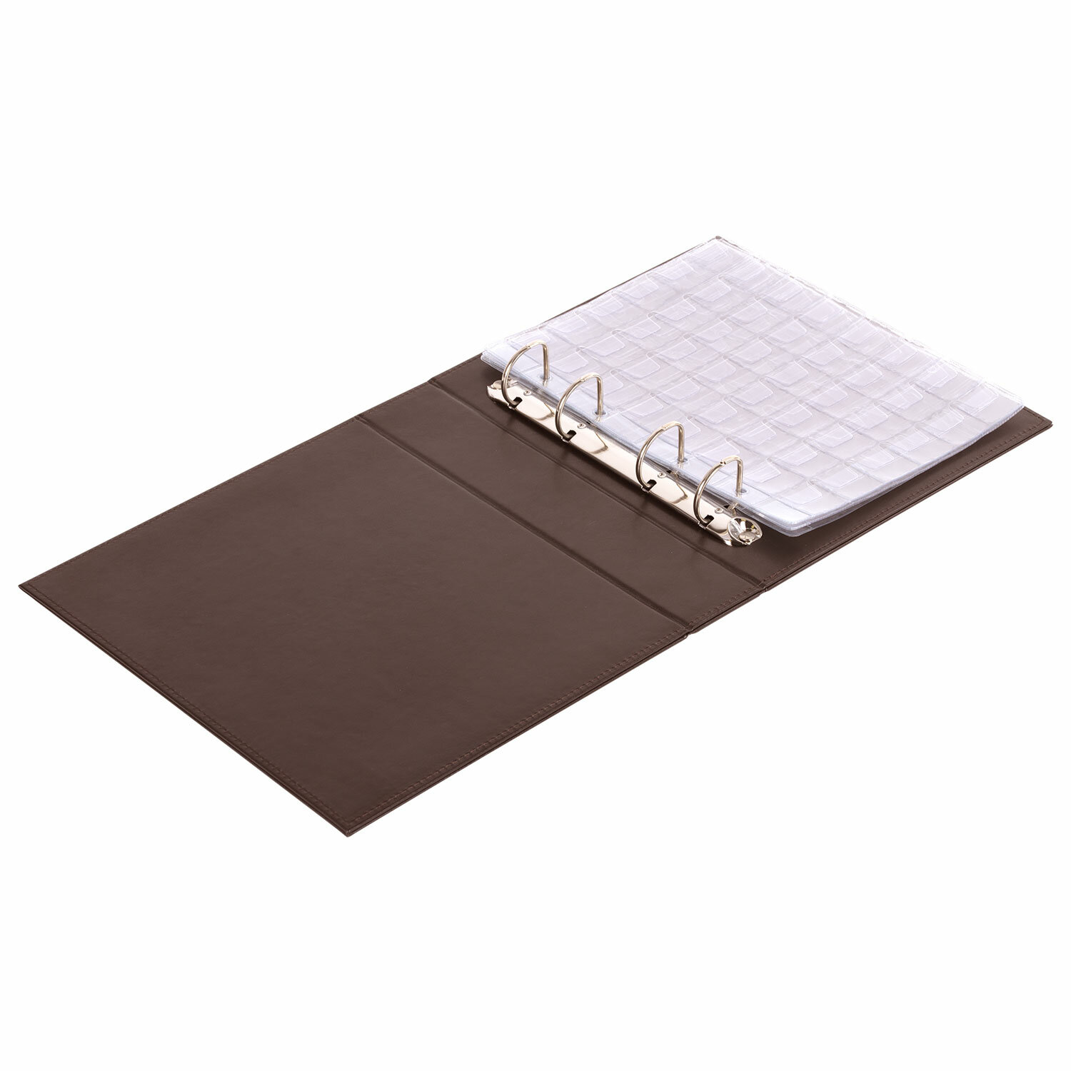 Альбом размером 245х270 мм выполнен из качественной экокожи и представлен в коричневом цвете. Укомплектован пятью листами-вкладышами для монет (листы для бон в комплект не входят): 2 листа с карманами размером 28х28 мм (48 шт.), 2 листа с карманами размером 35х35 мм (35 шт.) и 1 лист с карманами размером 44х40 мм (24 шт.). Итого альбом вмещает 190 монет диаметром до 38 мм. Материал листов – ПВХ.