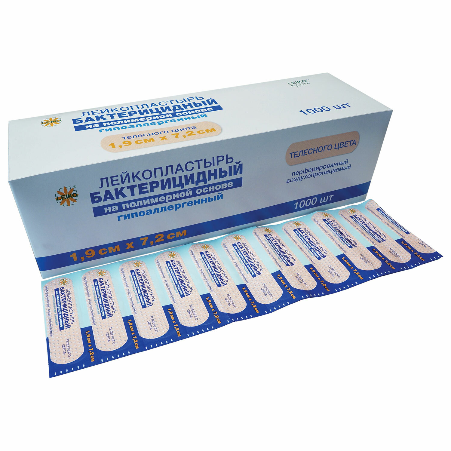- Лейкопластырь бактерицидный LEIKO комплект 1000 шт., 1,9х7,2 см, на полимерной основе, телесного цвета, 213575