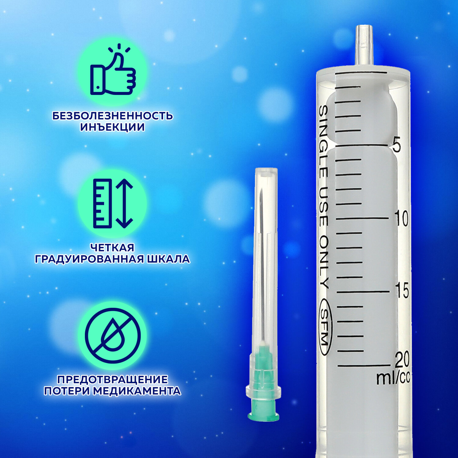 Безболезненность инъекции обуславливается легким скольжением поршня, без трения. Точная градуировка на шприце позволяет легко считывать показания. Двухкомпонентные шприцы выпущены с коаксиальным (по центру) расположением крепления иглы.