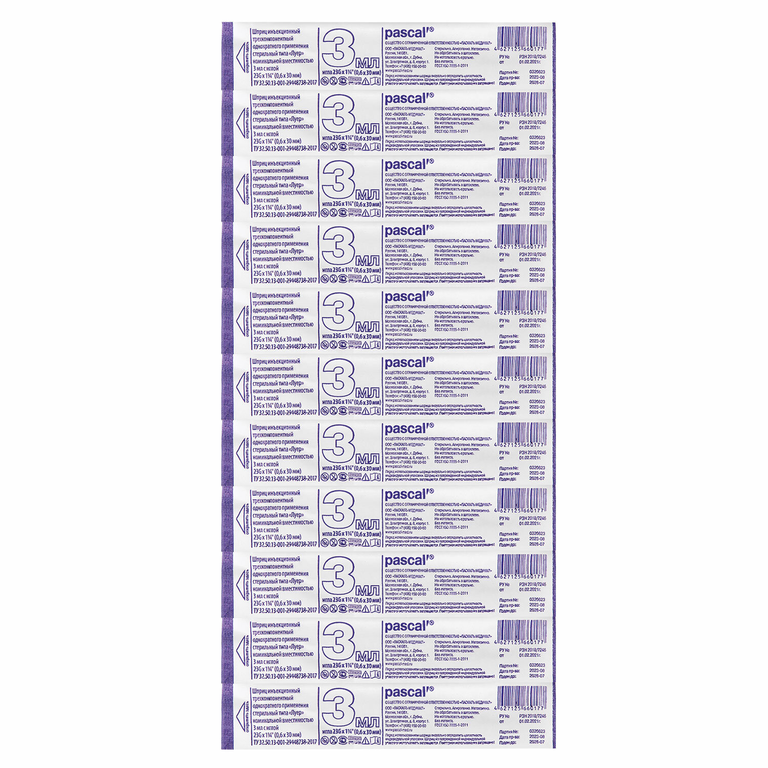 Индивидуальная стерильная блистерная упаковка с отогнутым краем — плотная медицинская бумага и прозрачная пленка (состав пленки — полиэтилен / полиамид). Упаковка вскрывается с небольшим усилием, что предотвращает самопроизвольное вскрытие, без образования бумажной бахромы. Метод стерилизации — этиленоксид (EO). Шприц 3-х компонентный PASCAL, 3 мл, КОМПЛЕКТ 100 шт. в пакете, игла 0,6х30 - 23G, 120305