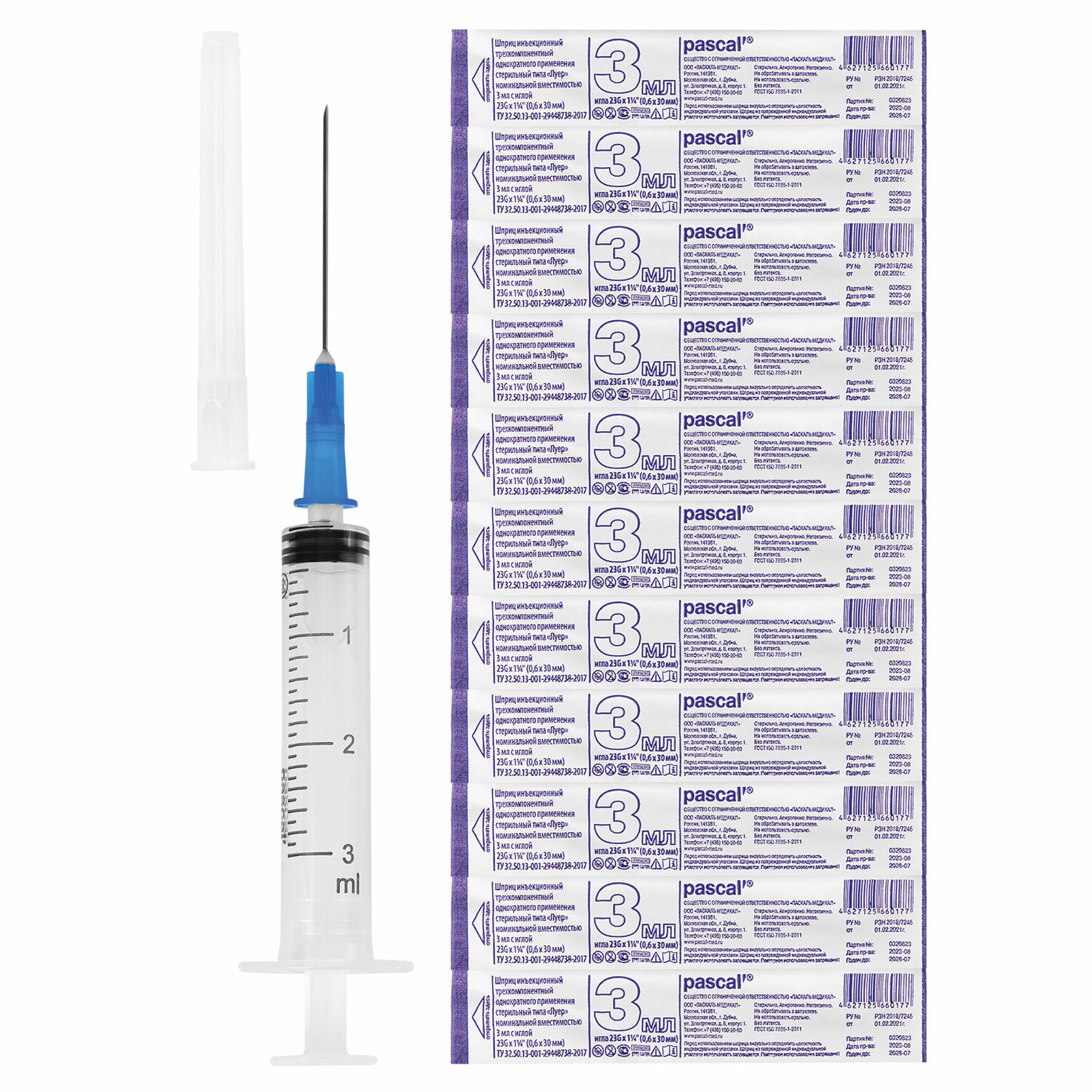 - Шприц 3-х компонентный PASCAL, 3 мл, КОМПЛЕКТ 100 шт. в пакете, игла 0,6х30 - 23G, 120305