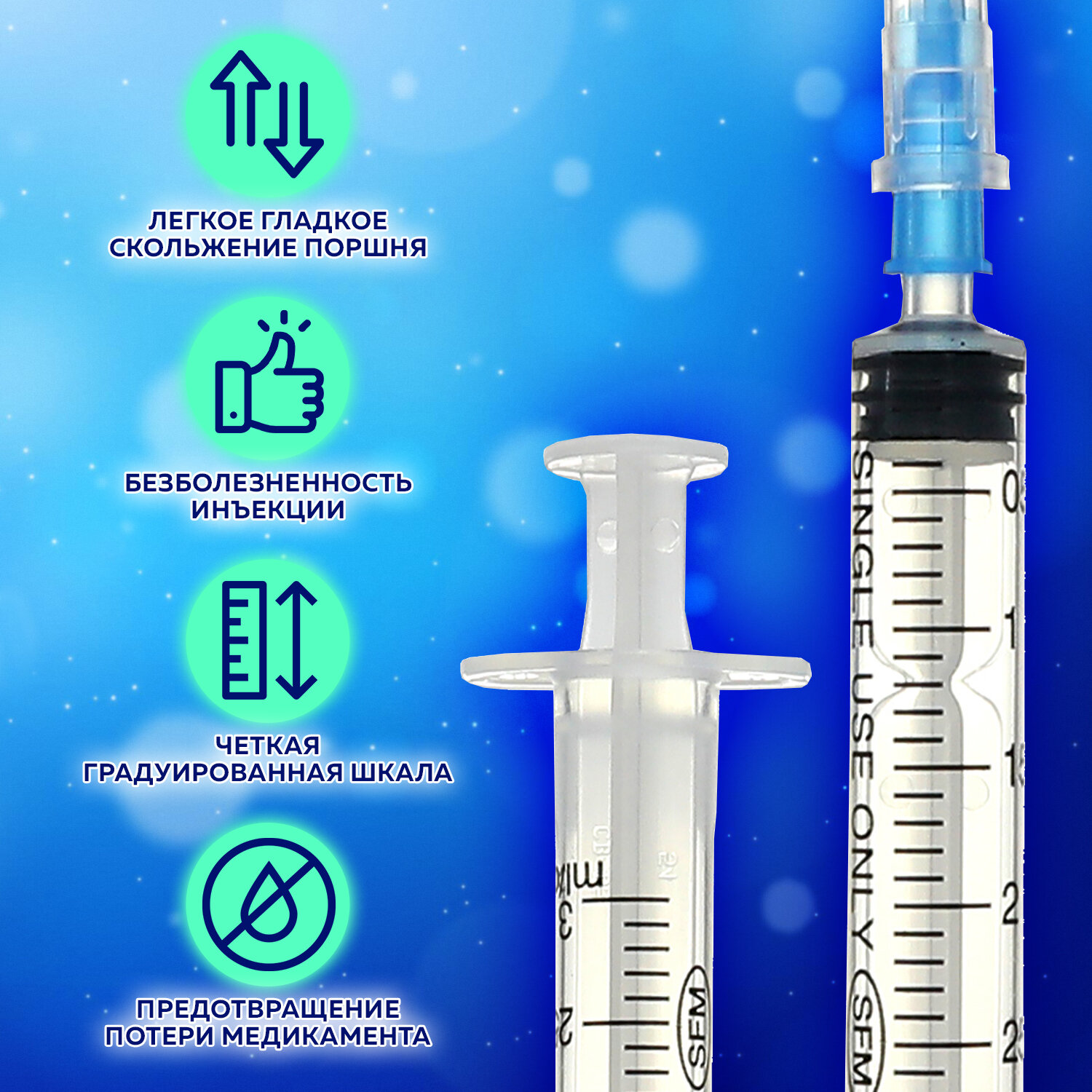 Применяют для выполнения подкожных, внутримышечных инъекций и других лечебно-диагностических мероприятий. Безболезненность инъекции обуславливается легким скольжением поршня, без трения. Удерживающее кольцо на поршне предотвращает потерю медикамента, а точная градуировка на шприце позволяет легко считывать показания. Форма и размер ободка вокруг цилиндра обеспечивают удобство и надежность захвата и удержания шприца в момент использования. Прочное двойное стопорное кольцо предотвращает случайное выдергивание поршня в момент набора лекарственного средства.
