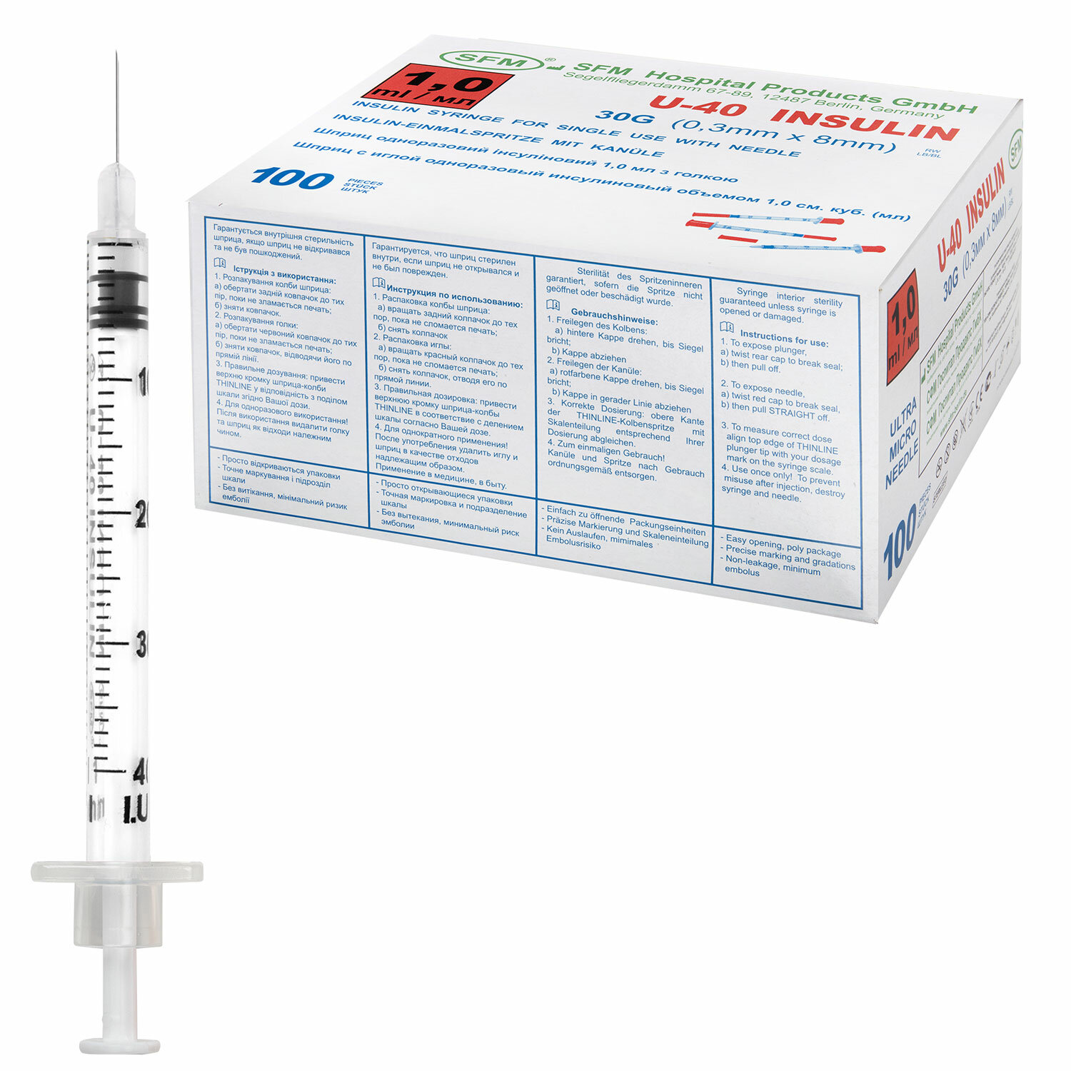 - Шприц инсулиновый SFM, 1 мл, КОМПЛЕКТ 10 шт., в пакете, U-40 игла несъемная 0,3х8 мм - 30G, 534254