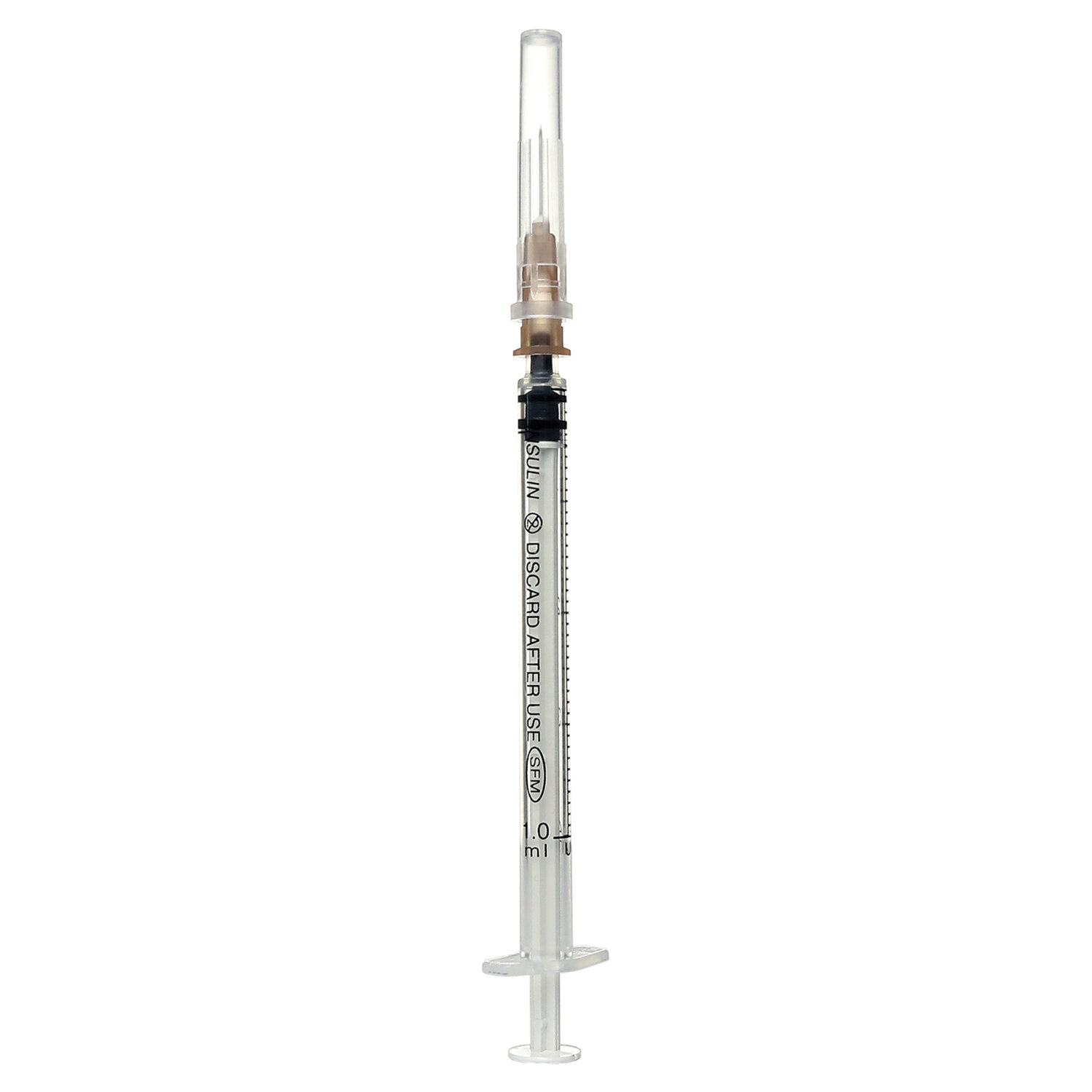 Трехкомпонентный одноразовый шприц состоит из трех частей: цилиндр, поршень, манжета на поршне, изготовлен из специального полипропилена. Нетоксичен, апирогенен. Объем – 1 мл, игла съемная, размер иглы – 26G. Шкала – U-40.