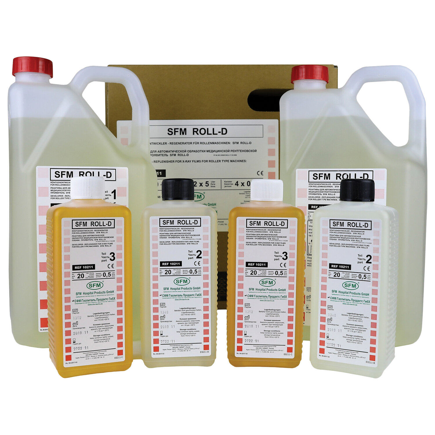 Для обработки 1 м2 медицинской рентгеновской пленки необходимо 400-600 мл раствора регенератора при стандартных условиях. Регенерация происходит автоматическим добавлением раствора в зависимости от количества обработанной пленки. Проявитель-концентрат для машинной обработки рентгеновских снимков SFM-ROLL-D, 2х20 л, 10211