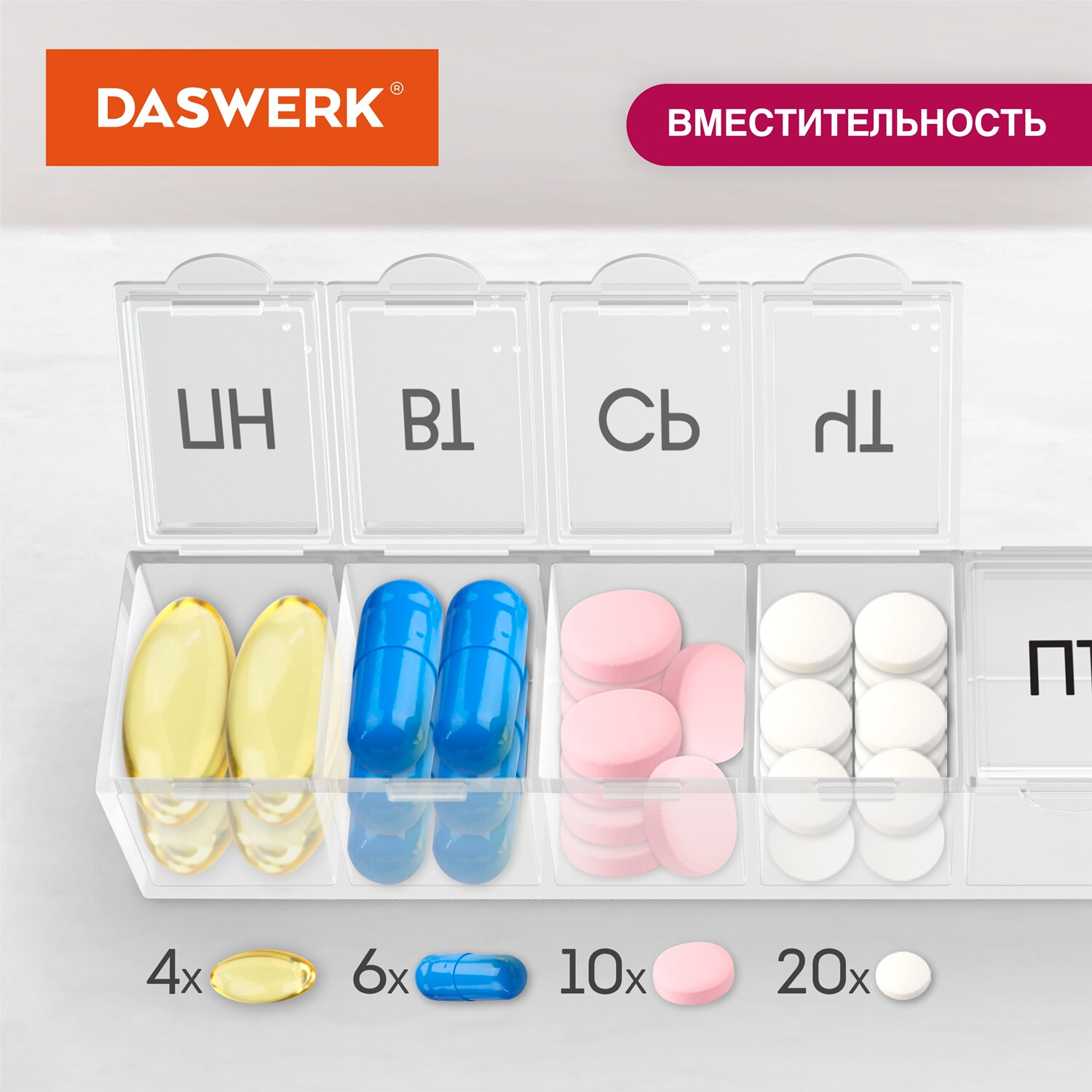 - ТАБЛЕТНИЦА / Контейнер для лекарств и витаминов "7 дней/1 прием" КОМПАКТНЫЙ, DASWERK, 630843