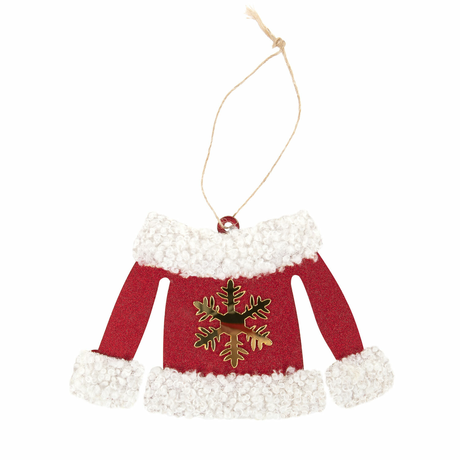 1 шт. красный свитер украшен блёстками и орнаментом в виде снежинок из золотой фольги, с белой меховой окантовкой низа, верха и рукавов;