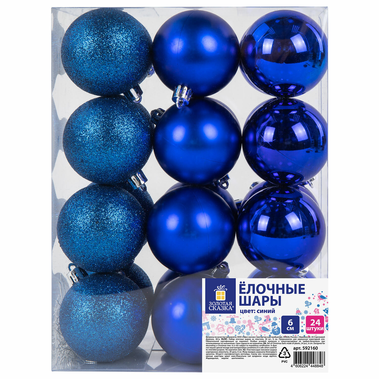 - Шары ёлочные 24 шт., 6 см, "Trio", пластик, СИНИЕ (глянец, матовый, глиттер), ЗОЛОТАЯ СКАЗКА, 592160