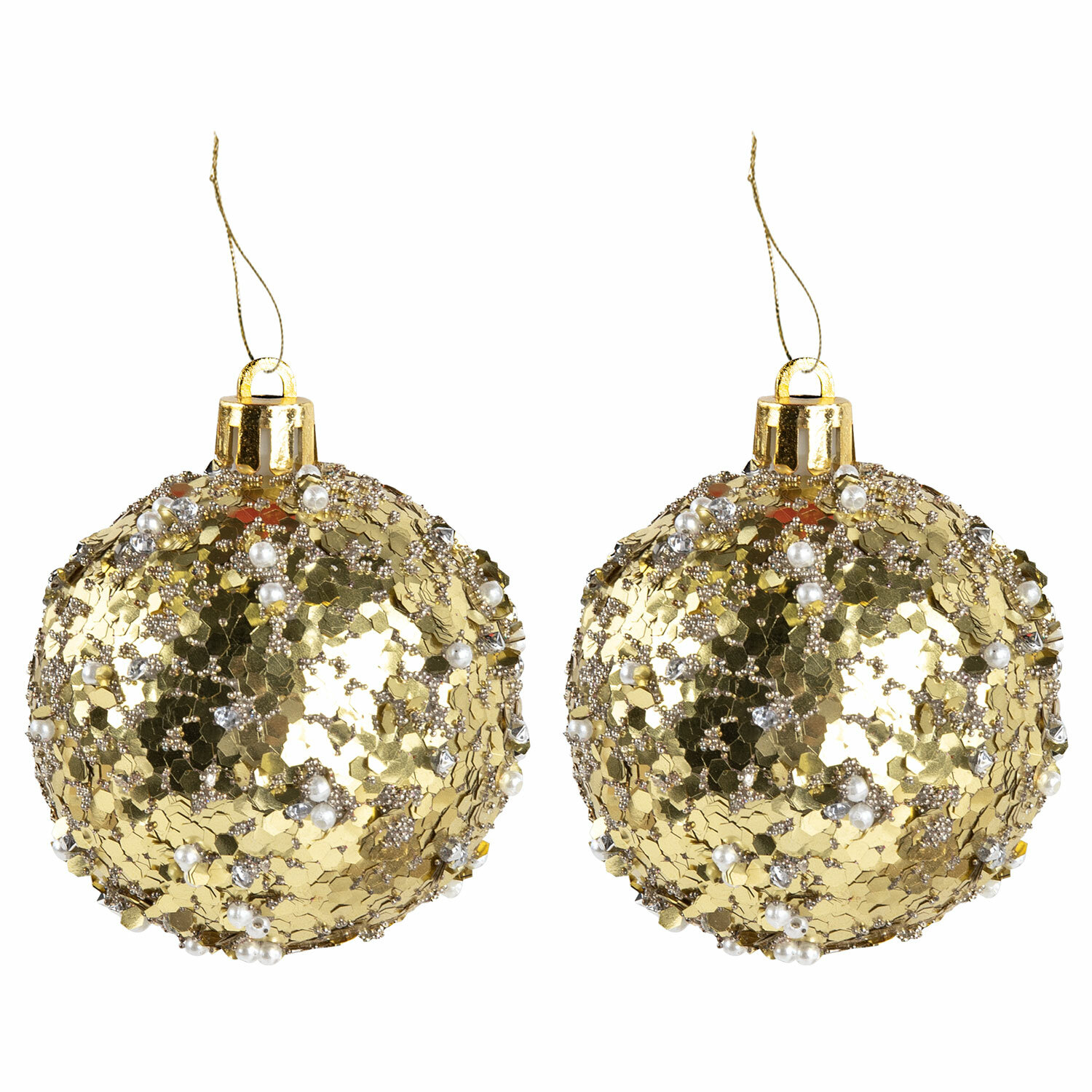 2 шара золотистого цвета диаметром 6 см с бисером с глянцевым эффектом,