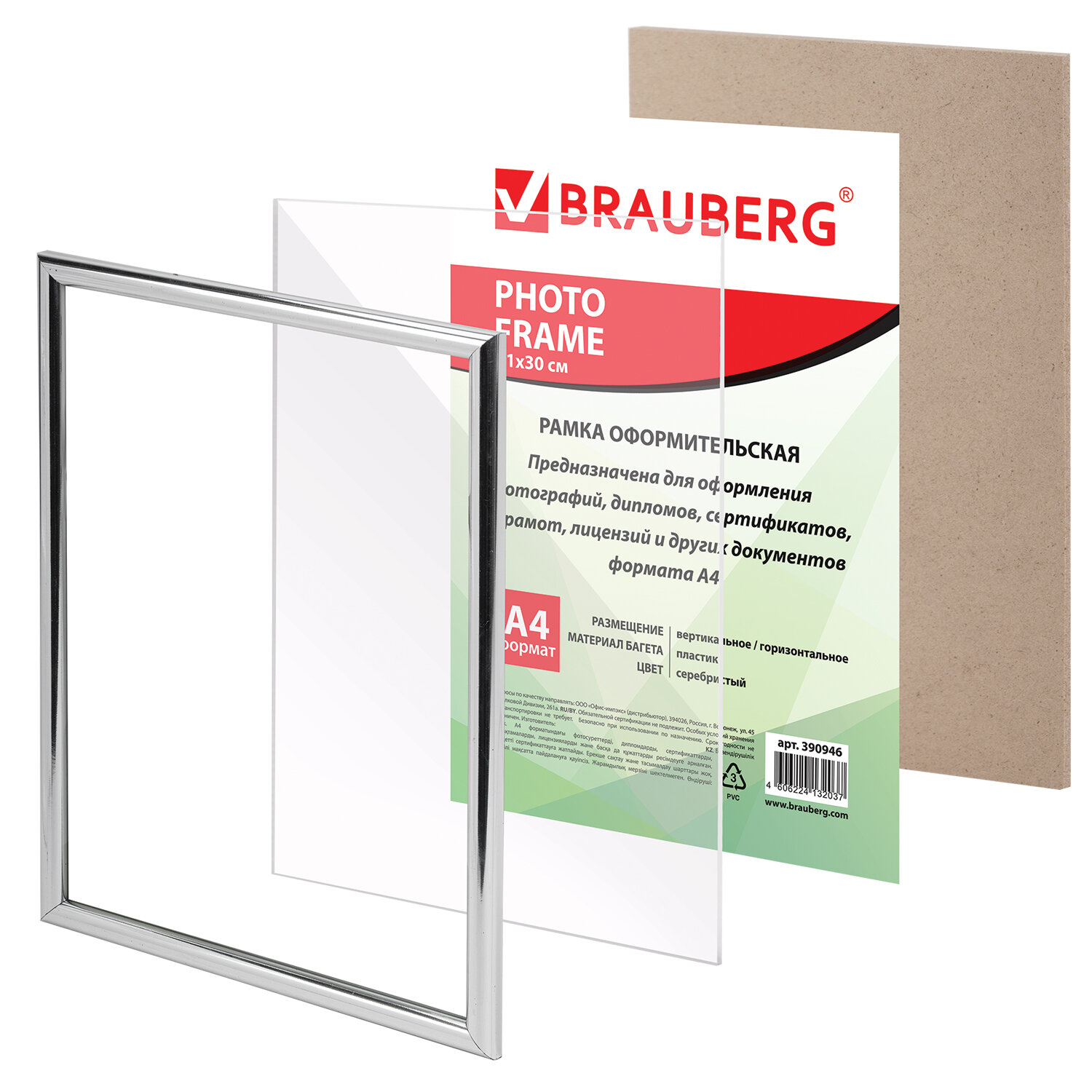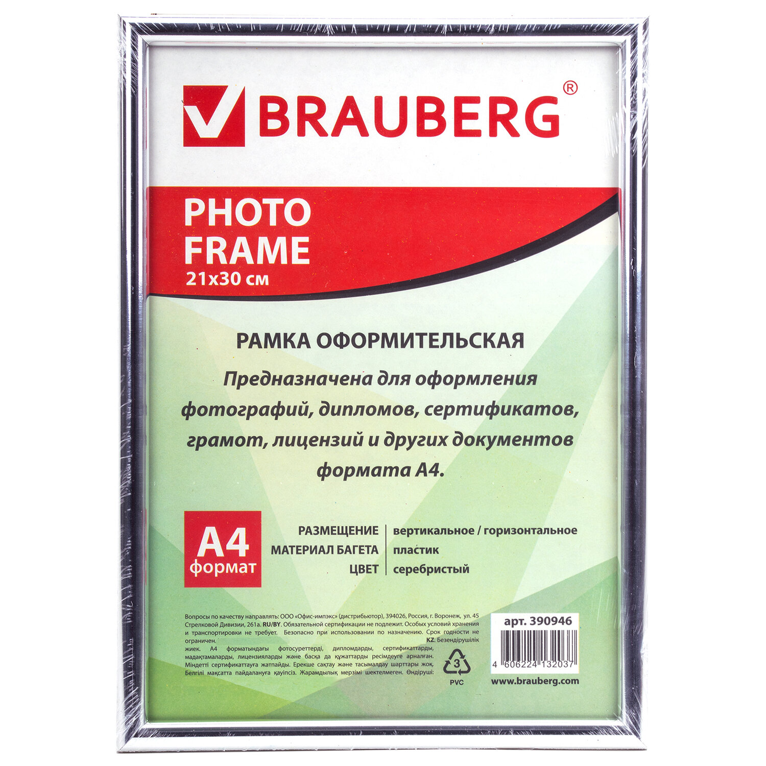 - Рамка 21х30 см, пластик, багет 12 мм, BRAUBERG "HIT2", серебро, стекло, 390946