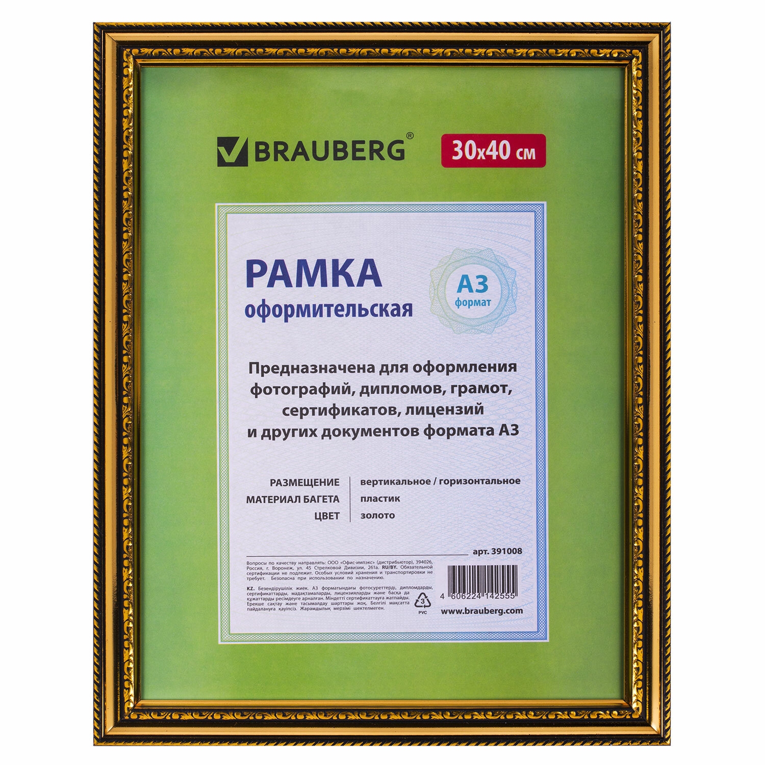 - Рамка 30х40 см, пластик, багет 30 мм, BRAUBERG "HIT4", золото, стекло, 391008