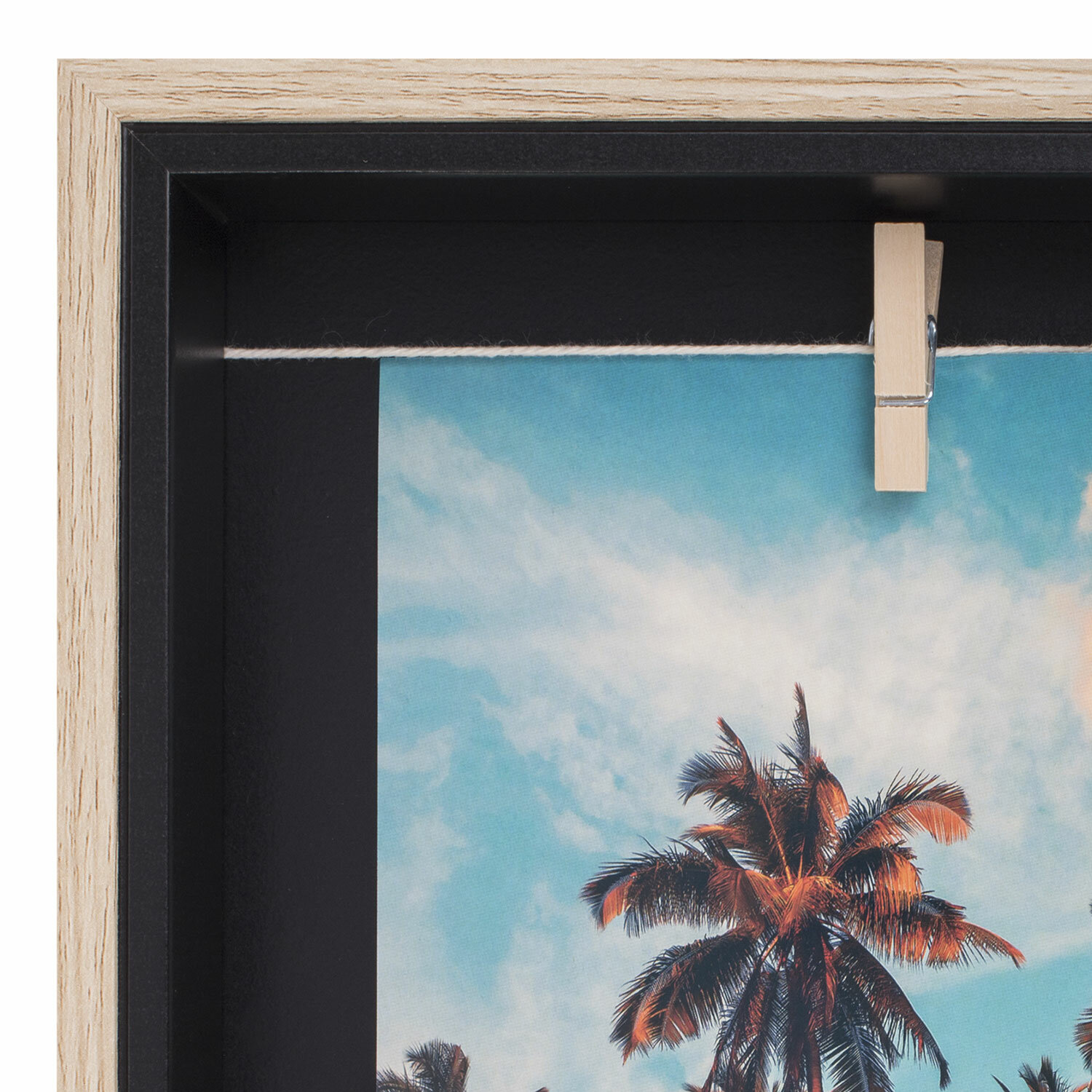 Рамка выполнена из качественного МДФ, внутри полностью окрашена черным цветом. За счёт комбинации цвета багета (светлое дерево + черный) достигается идеальное сочетание классики и современного стиля.