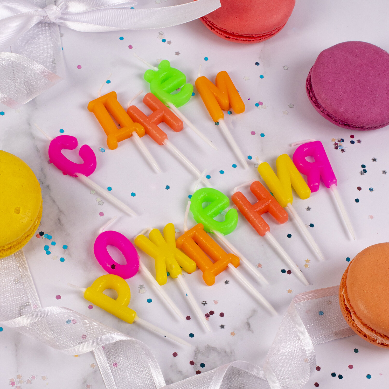 В состав набора входят 13 свечей желтого, оранжевого, красного, розового и зеленого цветов, которые выполнены в виде букв и составляют фразу t;С Днем рожденияt;. Свечи изготовлены из парафина и укомплектованы пластиковыми держателями-шпажками для удобства размещения в торте или другом кондитерском изделии. Высота буквы - 3 см. Свечи-буквы для торта на шпажках "С Днем рождения", 13 шт., 3 см, ЗОЛОТАЯ СКАЗКА, 591462