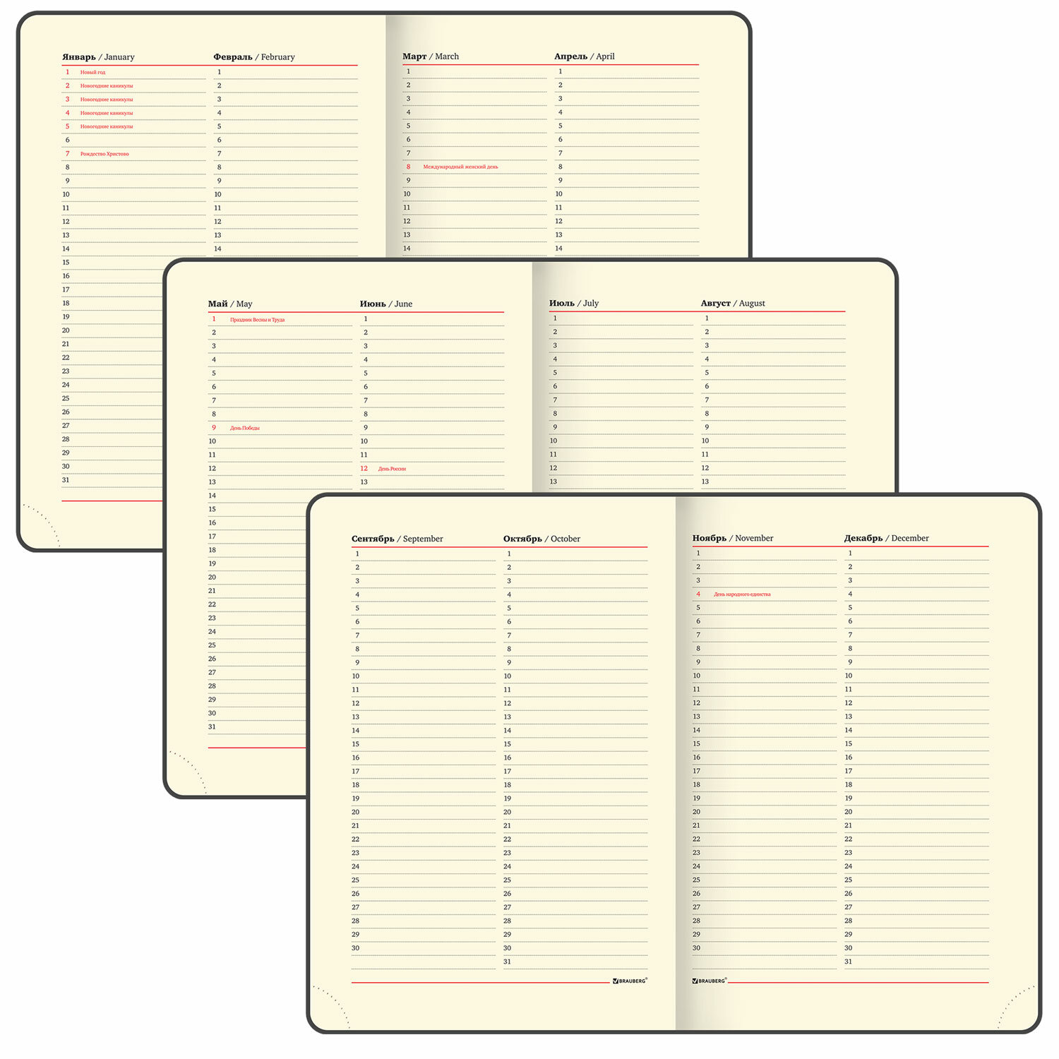 Срез ежедневника фольгирован золотой фольгой, что придает ему особый шарм. Дополнением является закладка-ляссе, с помощью которой можно быстро открыть ежедневник на нужной странице. Помимо прочего ежедневник снабжен справочным материалом. В конце ежедневника есть 3 страницы для записей и заметок.
