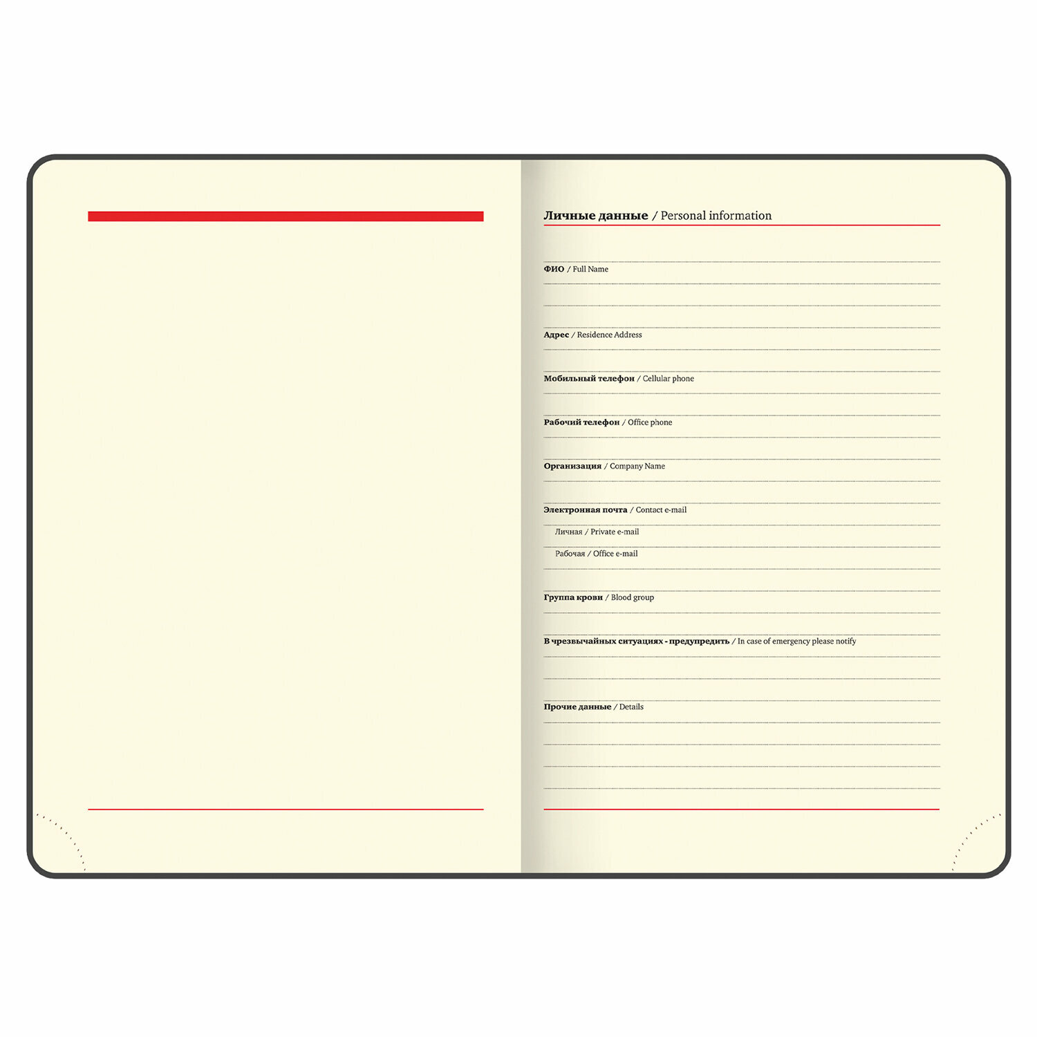 Срез ежедневника прокрашен, что придает ему особый шарм. Дополнением является закладка-ляссе, с помощью которой можно быстро открыть ежедневник на нужной странице. Помимо прочего ежедневник снабжен справочным материалом. В конце ежедневника есть 3 страницы для записей и заметок.