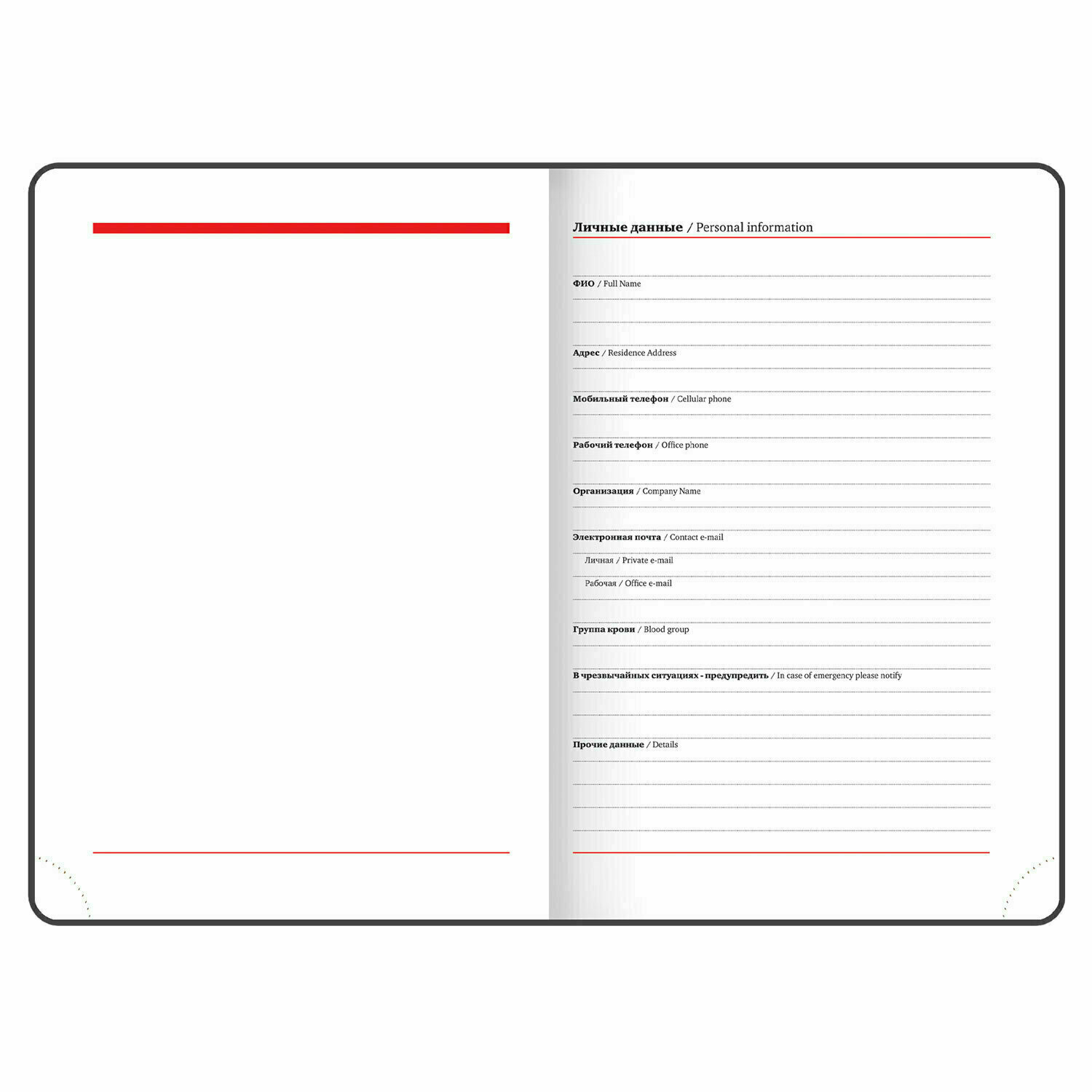 Внутренний блок включает 136 листов белой бумаги плотностью 70 г/м2. Благодаря стандартному формату А5 ежедневник удобно использовать как в офисе, так и на выездных деловых встречах. Интегральная (мягкая) обложка с полноцветной печатью и тиснением серебряной фольгой делает ежедневник неповторимым и запоминающимся.