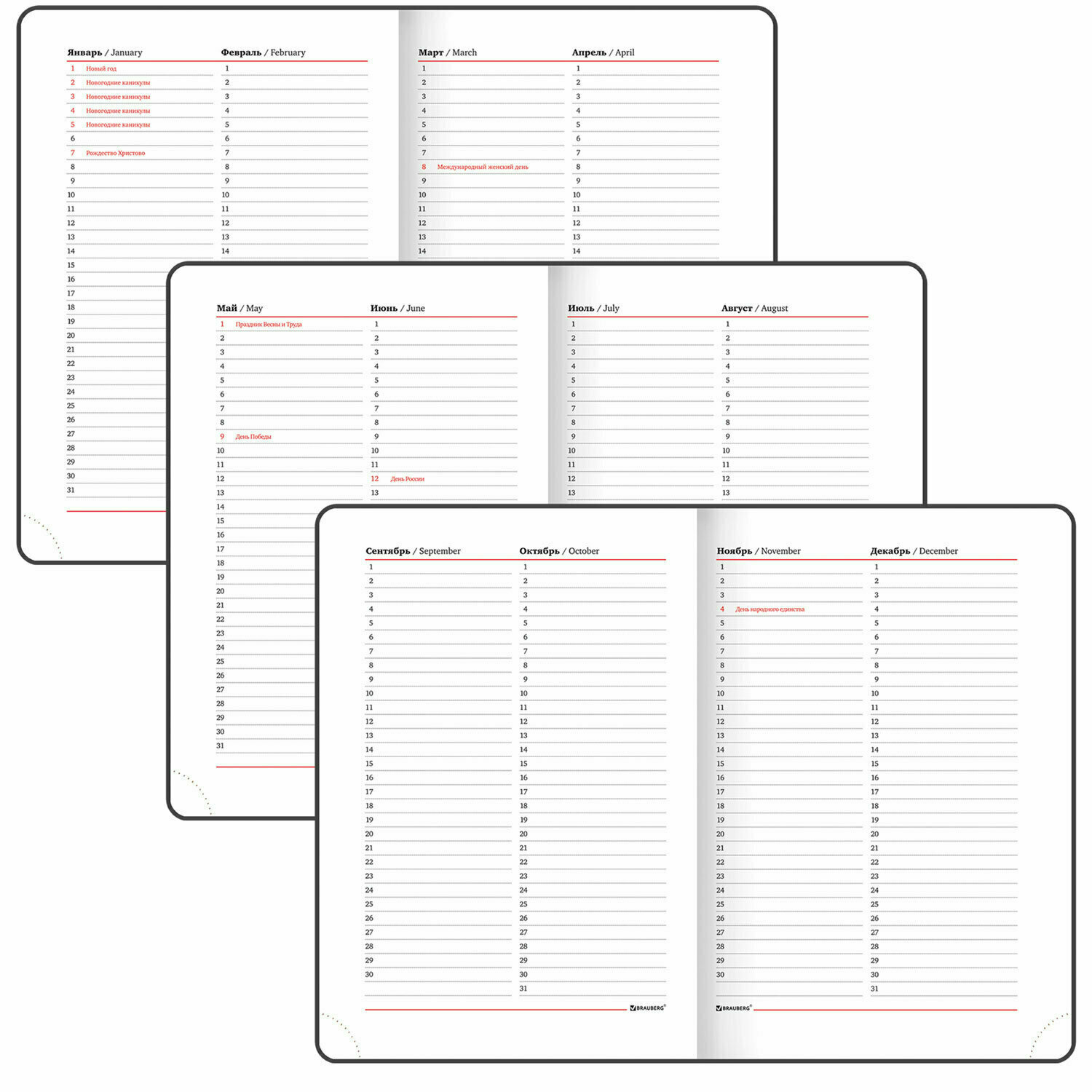 Срез ежедневника окрашен в цвет обложки, что придает ему особый шарм. Дополнением является закладка-ляссе, с помощью которой можно быстро открыть ежедневник на нужной странице. Помимо прочего ежедневник снабжен справочным материалом. В конце ежедневника есть 3 страницы для записей и заметок.