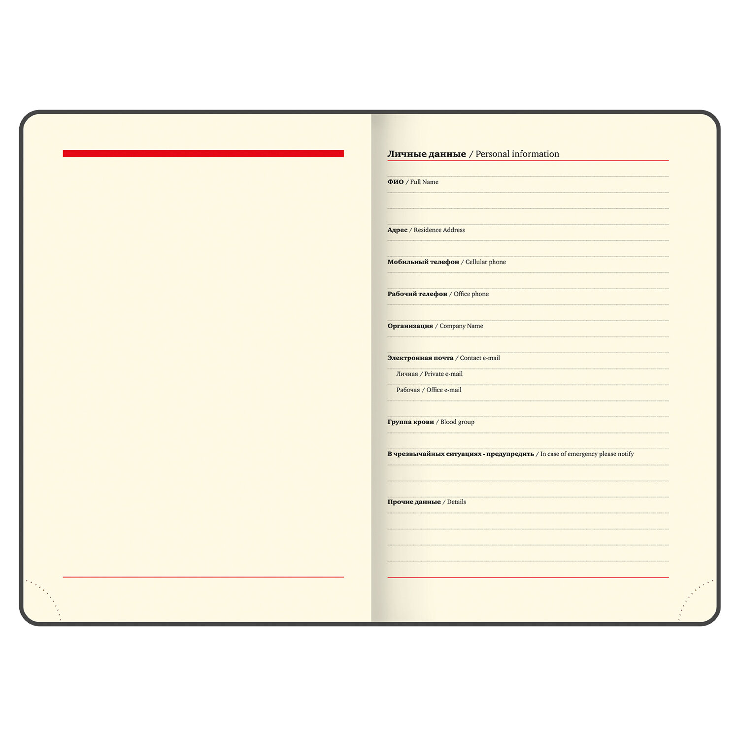 Внутренний блок включает 160 листов тонированной бумаги плотностью 70 г/м2. Каждая страничка имеет перфорированный угол. Благодаря большому формату А4 (210х297 мм) ежедневник удобно использовать как в офисе, так и на выездных деловых встречах. Твердая обложка стилизована под гладкую кожу. Подходит для горячего тиснения. Снабжен резинкой-фиксатором, благодаря чему ежедневник не откроется в сумочке или портфеле и листы не помнутся.