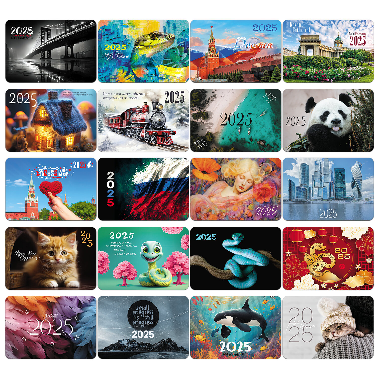 Ассорти календарей (20 видов) с разными современными дизайнами. Размер – 64х93 мм. Сделаны из картона 190г/м2, скругленные уголки, заливка УФ-лаком на постере. Календарная сетка на 2025 год в 2 краски.