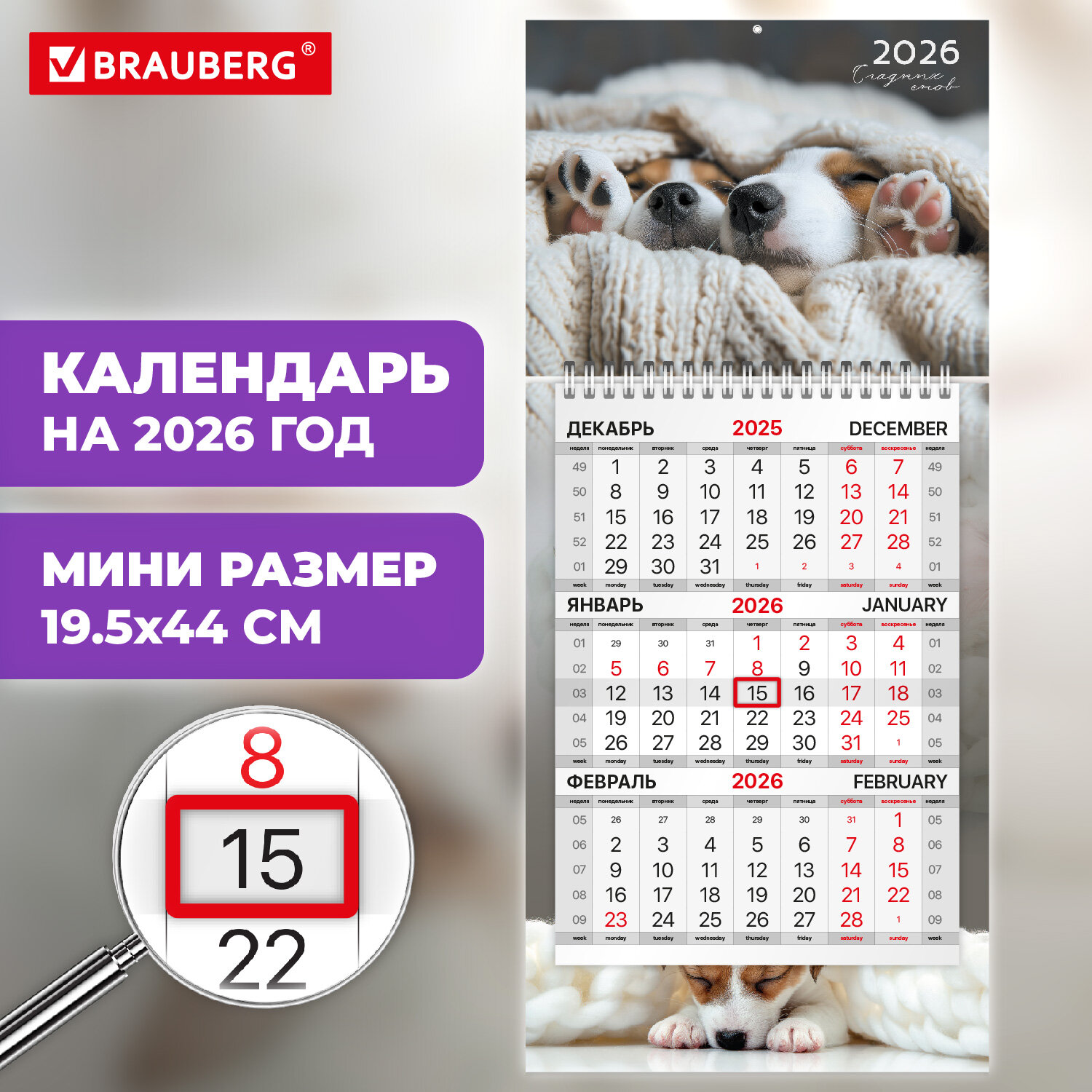 Календари BRAUBERG импортного производства отпечатаны на современном высокотехнологичном оборудовании и соответствуют стандартам качества. Календарь квартальный 2026 г., 1 блок, 1 гребень, бегунок, МИНИ, офсет, BRAUBERG, "Милые щенки", 116848
