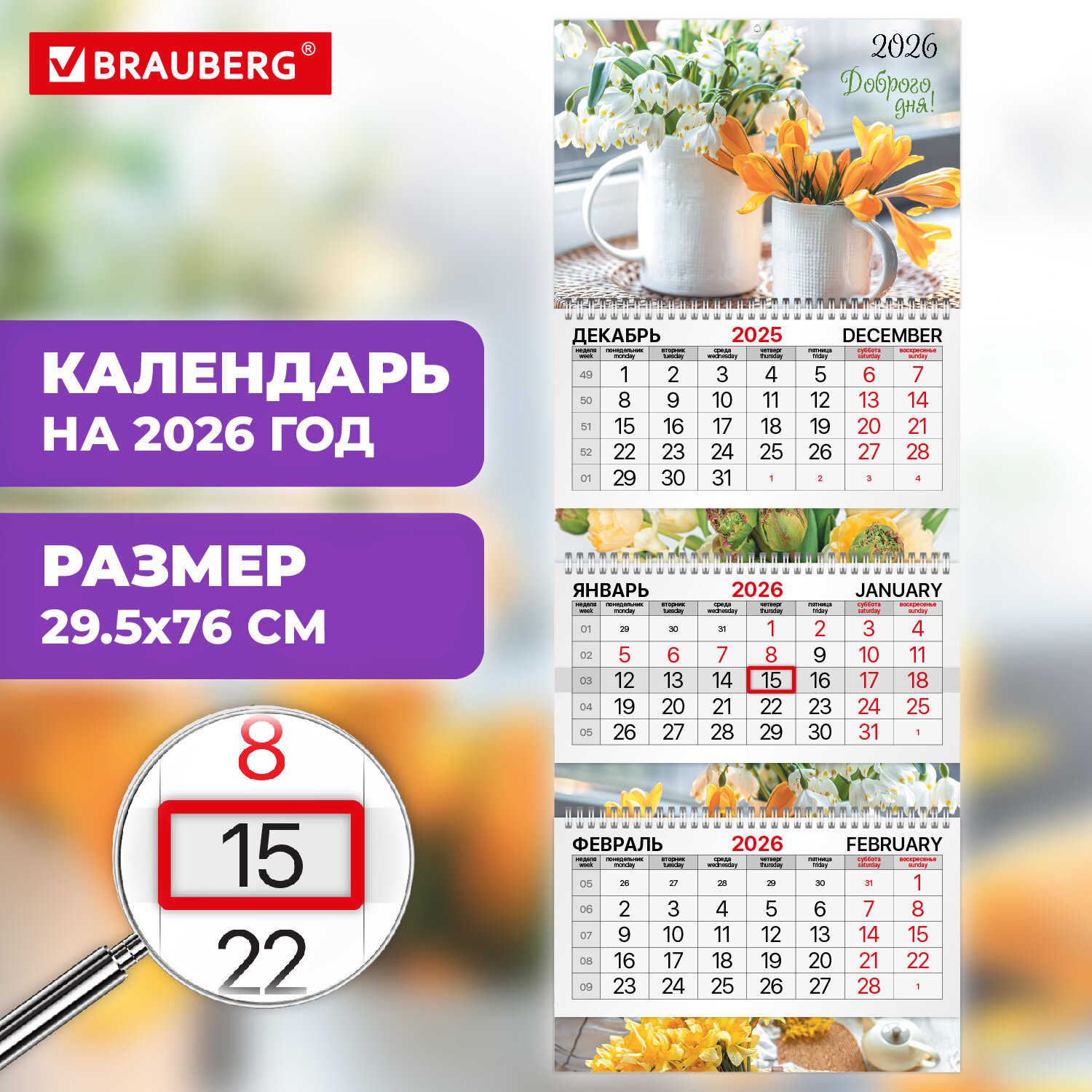- Календарь квартальный 2026г, 3 блока 3 гребня бегунок, мелованная бумага, BRAUBERG EXTRA, Букет на окне, 116820