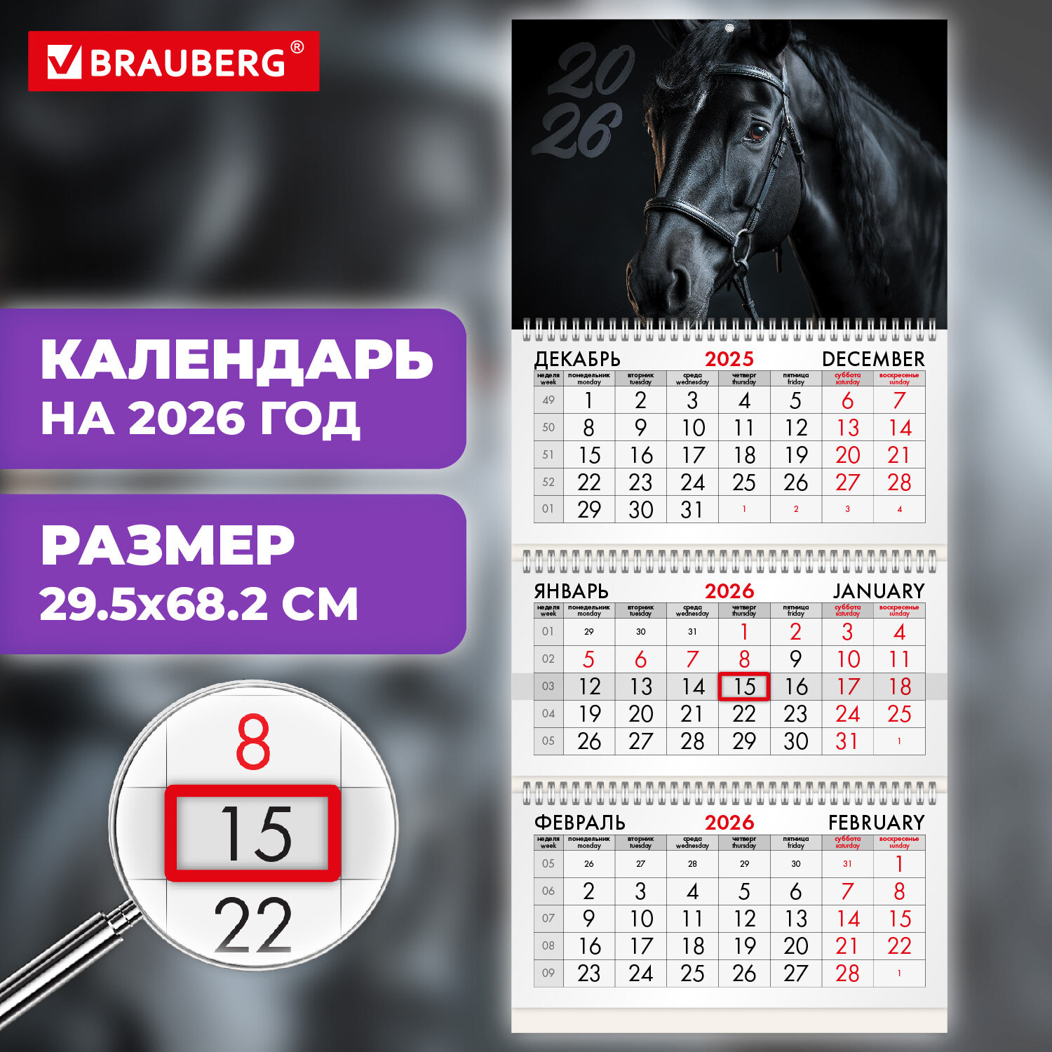 Размер – 29,5х68,2 см. Поставляется в индивидуальной упаковке (полибег) с европодвесом и с прокладкой из гофрокартона, что создает дополнительную защиту товару. Календарь квартальный 2026г, 3 блока 3 гребня бегунок, мелованная бумага, BRAUBERG, Символ год, 116790