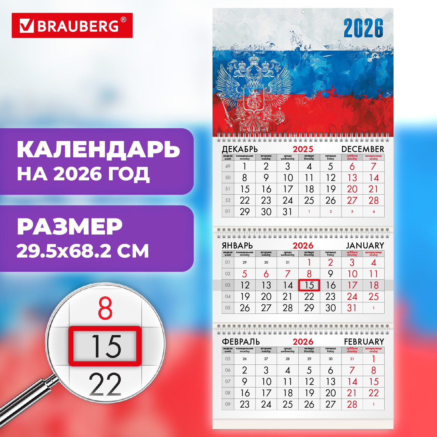 Размер – 29,5х68,2 см. Поставляется в индивидуальной упаковке (полибег) с европодвесом и с прокладкой из гофрокартона, что создает дополнительную защиту товару. Календарь квартальный 2026г, 3 блока 3 гребня бегунок, мелованная бумага, BRAUBERG, Символика, 116789