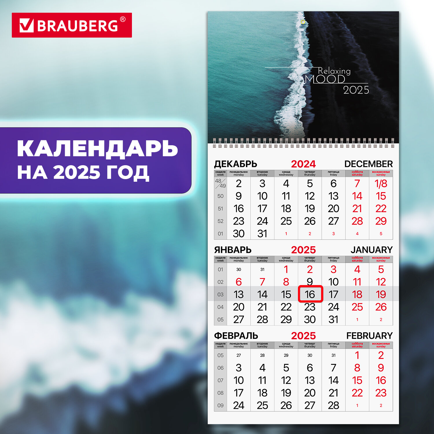 - Календарь квартальный на 2025 г., 1 блок, 1 гребень, с бегунком, офсет, BRAUBERG, "Relaxing", 116113