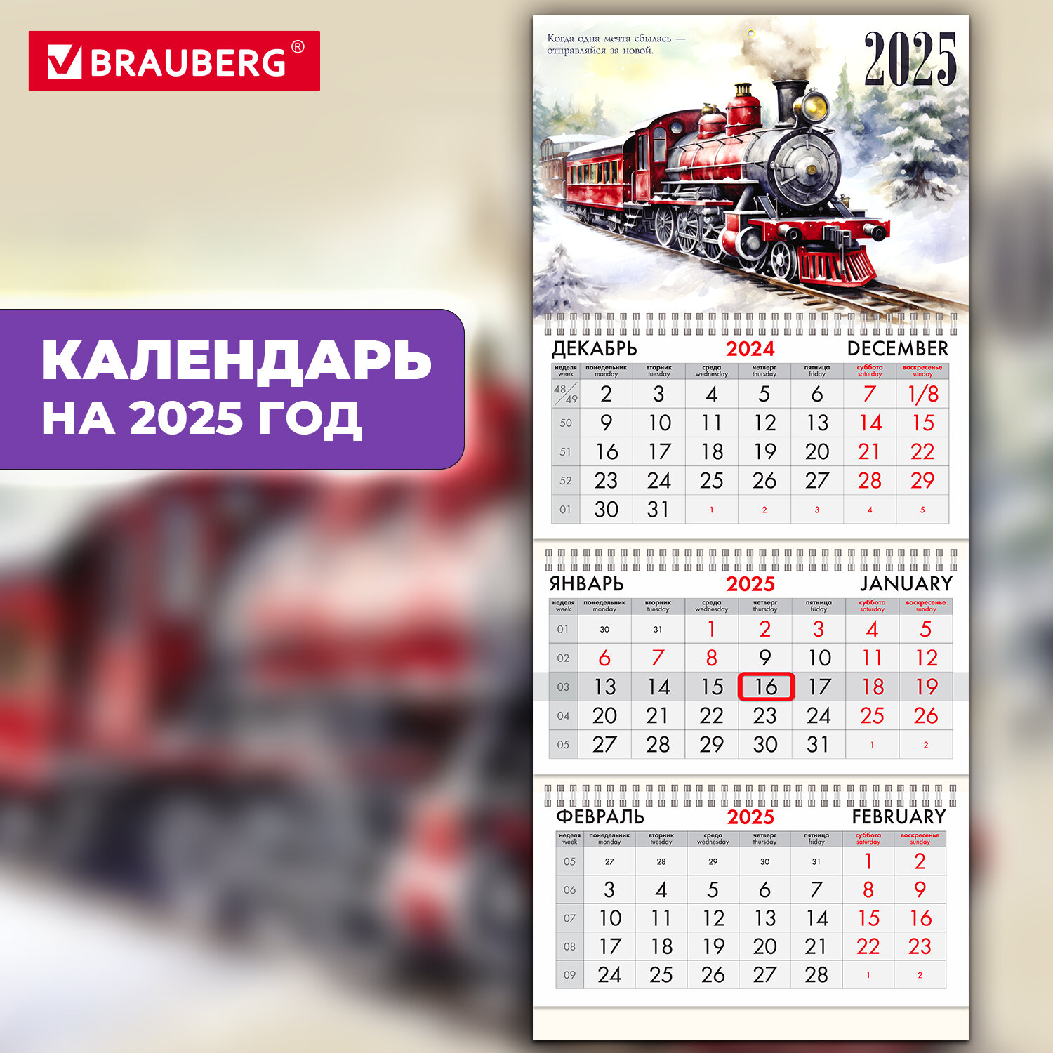 Размер – 29,5х69,4 см. Поставляется в индивидуальной упаковке (полибег) с европодвесом и с прокладкой из гофрокартона, что создает дополнительную защиту товару. Календарь квартальный на 2025 г., 3 блока, 3 гребня, с бегунком, мелованная бумага, BRAUBERG, "Паровозик", 116142