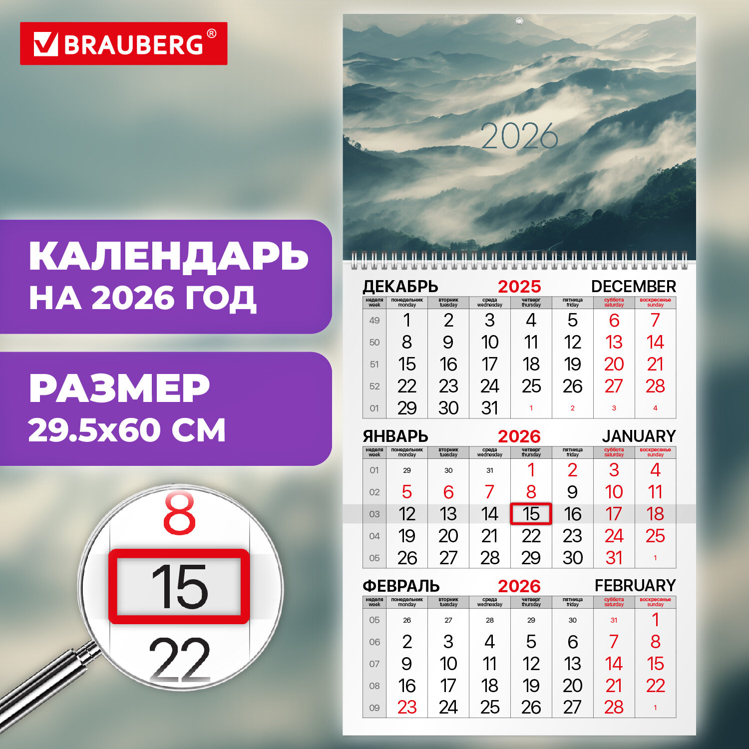Календарь квартальный на 2026 г., 1 блок, 1 гребень, бегунок, офсет, BRAUBERG, "Горы", 116742