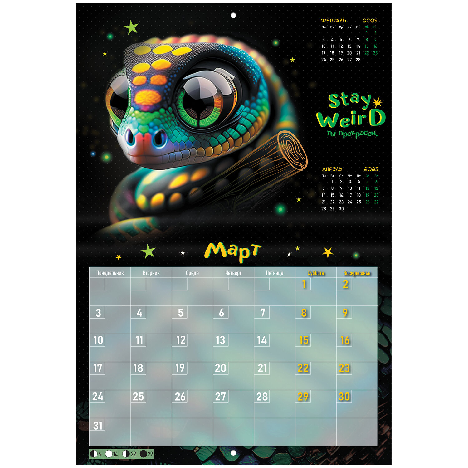 Яркая, красочная картинка дополнена календарной сеткой на месяц с местом для записи на каждый день. Содержит 12 листов. Блок календаря напечатан на мелованной бумаге плотностью 130 г/м2. Обложка изготовлена из мелованной бумаги плотностью 230 г/м2. Размер – 30х22 см, в развороте – 30х44 см. Дополнен отверстием для удобства крепления. Поставляется в индивидуальной упаковке (полибэг) с европодвесом и прокладкой из гофрокартона, что создает товару дополнительную защиту. Календарь-планер настенный перекидной на 2025 г., BRAUBERG, 12 листов, 30х22 см, "Символ года", 116172