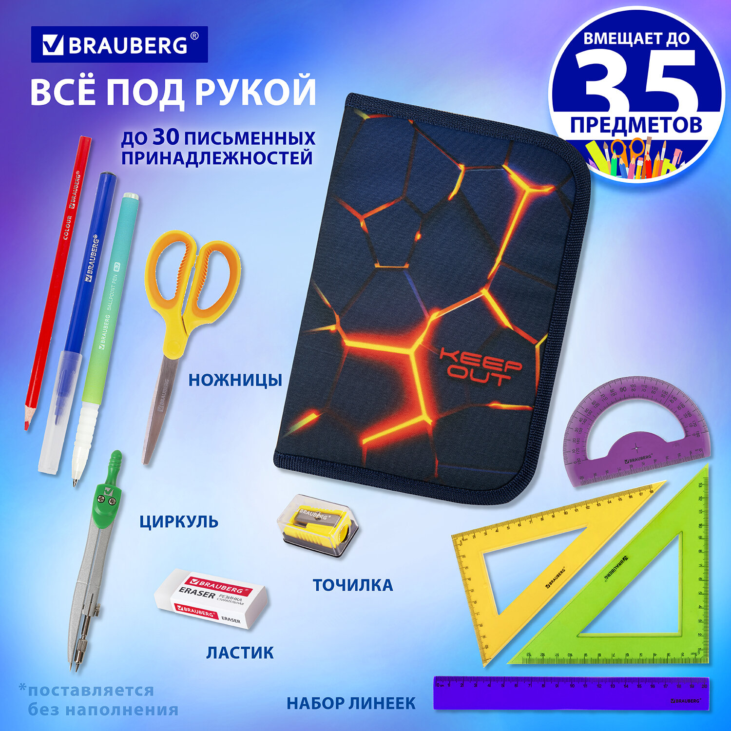 Упакован в ПЭТ-пакет с европодвесом, который сохранит качество и товарный вид при хранении и транспортировке. Пенал BRAUBERG, 1 отделение, 2 откидные планки, полиэстер, 21х14 см, "Keep out", 270719