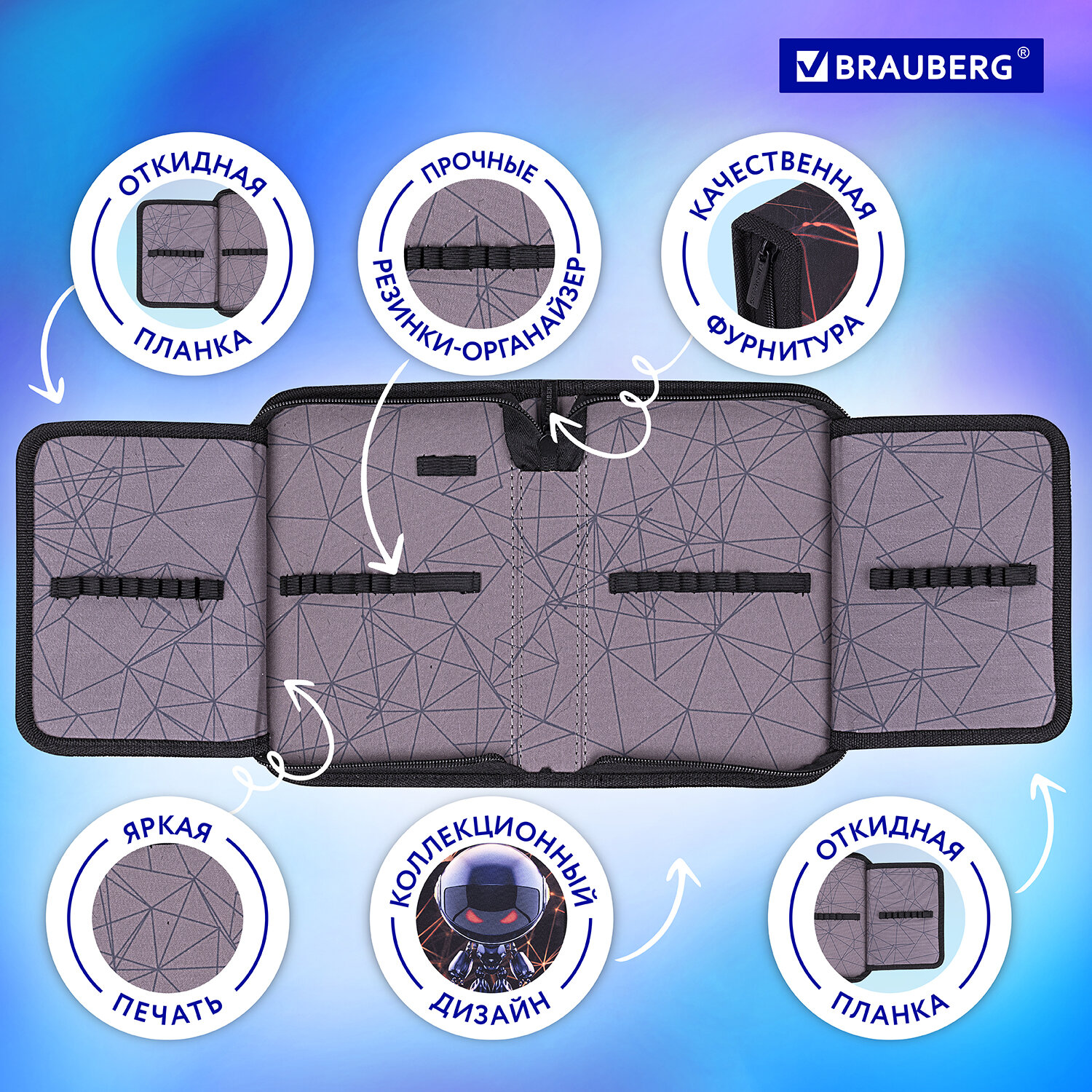 Упакован в ПЭТ-пакет с европодвесом, который сохранит качество и товарный вид при хранении и транспортировке. Пенал BRAUBERG, 1 отделение, 2 откидные планки, полиэстер, 21х14 см, "UFO", 271516