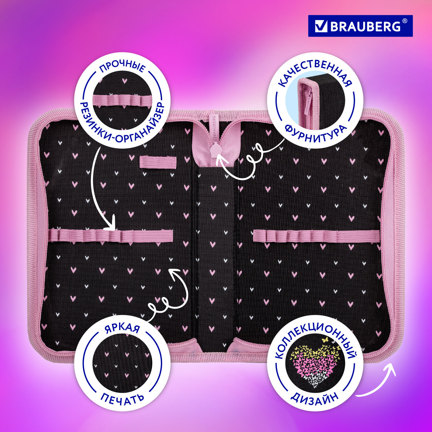 - Пенал BRAUBERG, 1 отделение, полиэстер, 21х14 см, "Shining heart", 272326