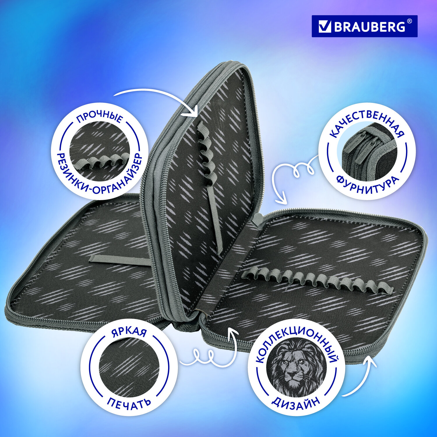 Упакован в ПЭТ-пакет с европодвесом, который сохранит качество и товарный вид изделия при хранении и транспортировке. Пенал BRAUBERG, 2 отделения, полиэстер, 21х14 см, "Savage lion", 272331
