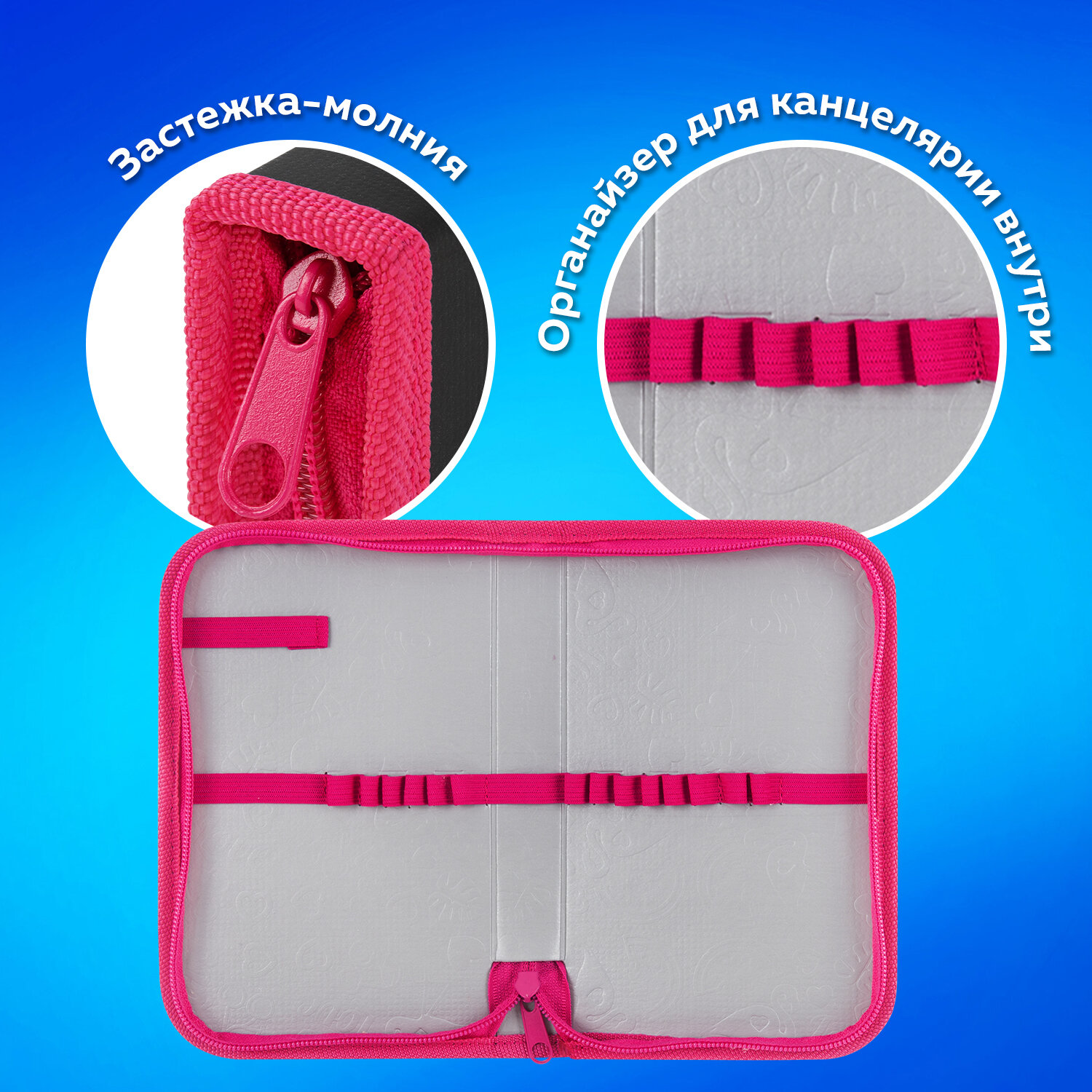 Внутри пенала на каждой створке прочно пришиты резинки-органайзеры для канцелярских принадлежностей. Внутренняя часть выполнена из картона с глянцевой ламинацией и узором.