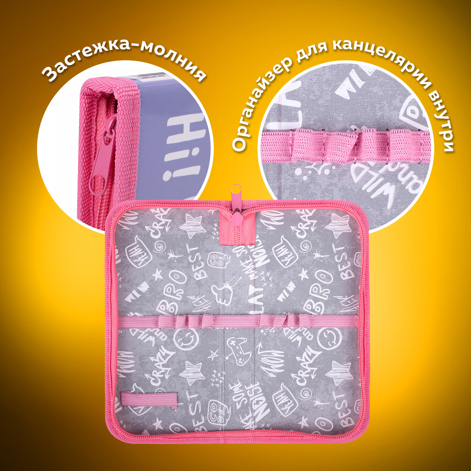 Основа пенала – плотный ламинированный картон, обшитый тканью по краям. Такая конструкция отличается износостойкостью и прочностью, поможет защитить канцелярские принадлежности от повреждений.