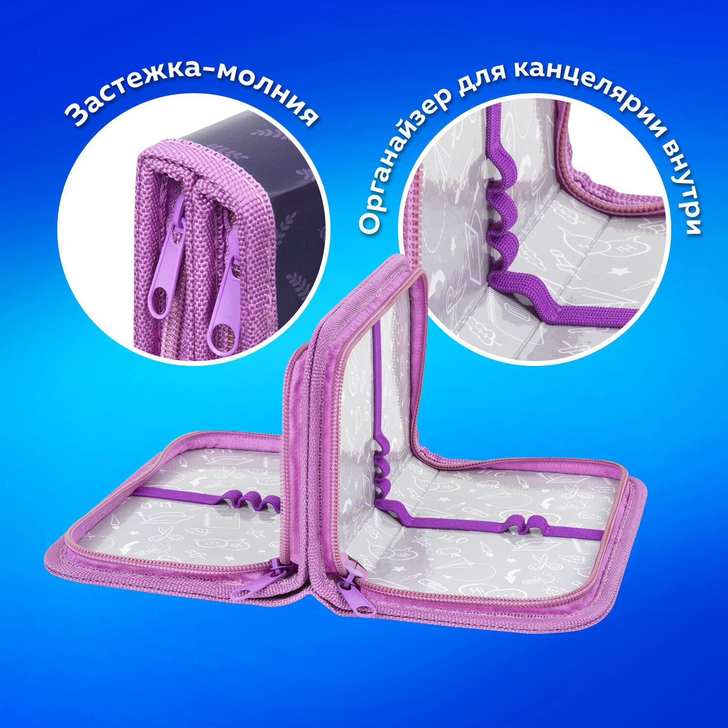 Пенал имеет 2 отделения, внутри на каждой створке имеются прочные резинки для канцелярских принадлежностей. Внутренняя часть выполнена из картона с глянцевой ламинацией с узором.