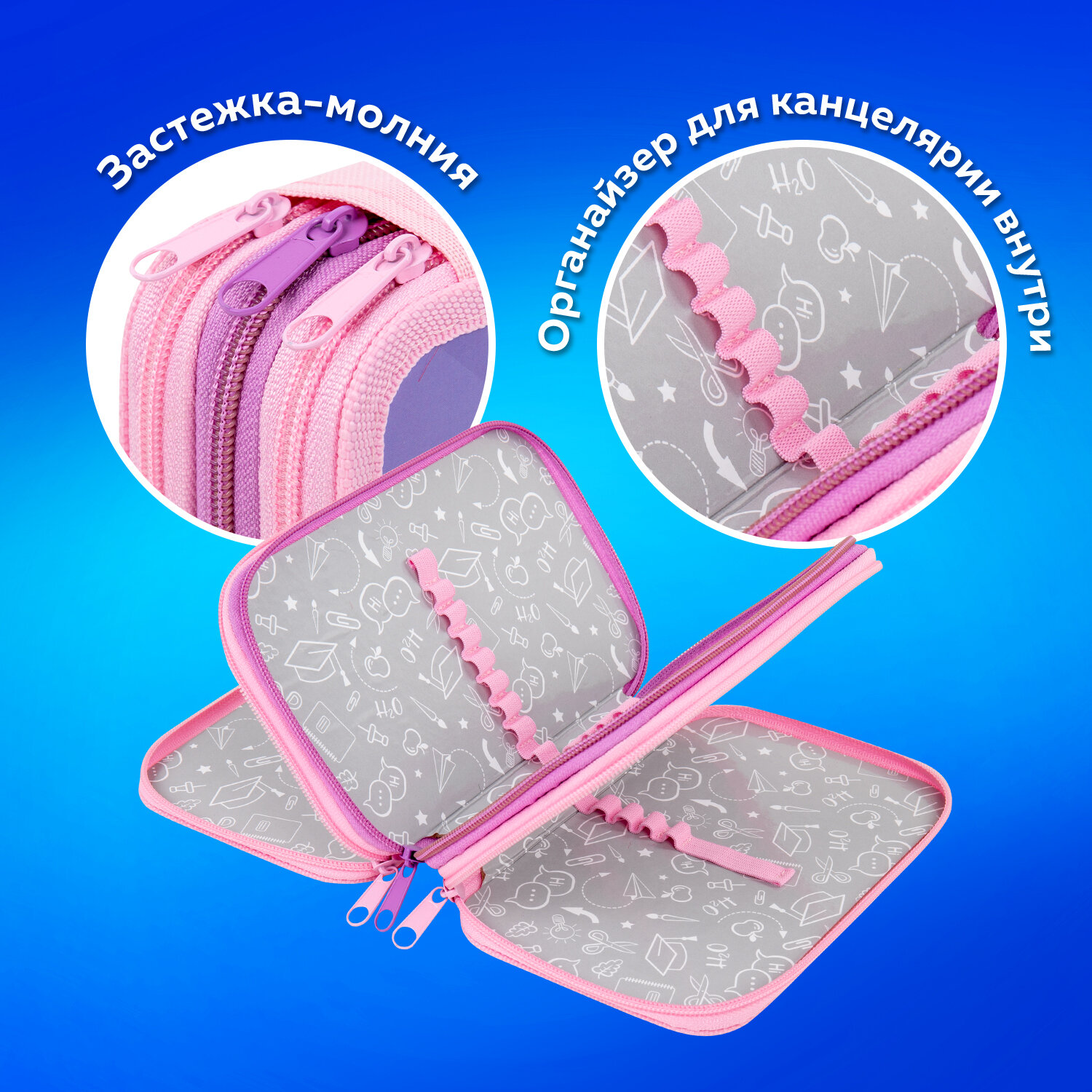 Пенал имеет 3 отделения, внутри на каждой створке имеются прочные резинки для канцелярских принадлежностей. Внутренняя часть выполнена из картона с глянцевой ламинацией с узором.