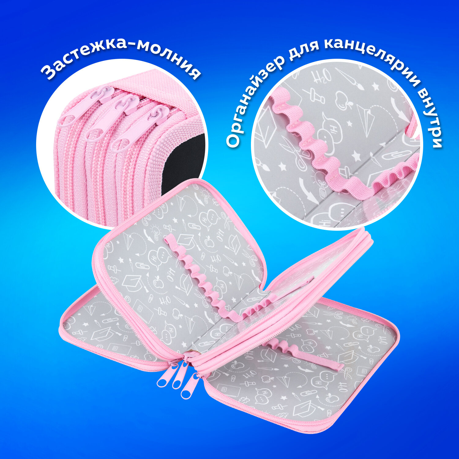 Пенал имеет 3 отделения, внутри на каждой створке имеются прочные резинки для канцелярских принадлежностей. Внутренняя часть выполнена из картона с глянцевой ламинацией с узором.