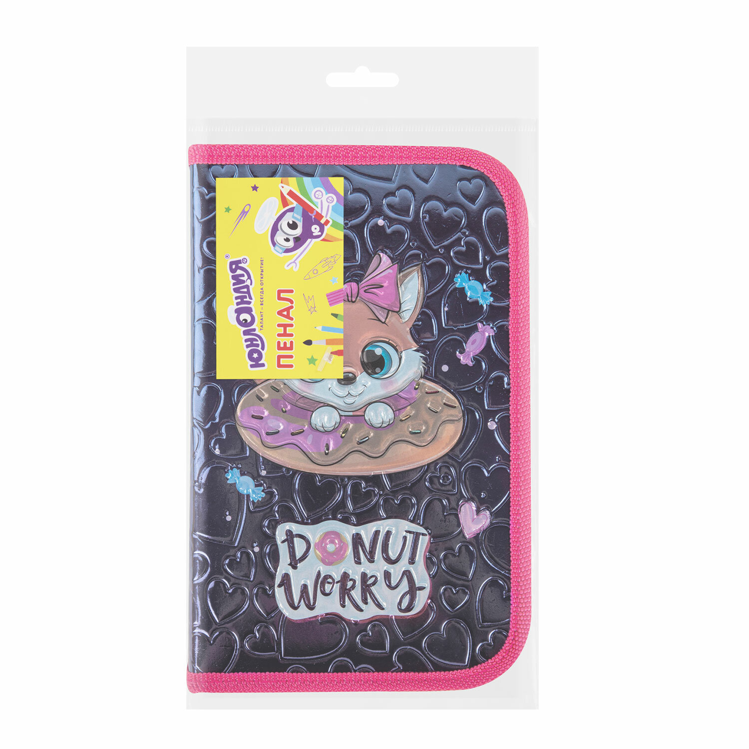 Упакован в ПЭТ-пакет с европодвесом, который сохранит качество и товарный вид изделия при хранении и транспортировке. Пенал ЮНЛАНДИЯ, 1 отделение, металлизированный картон, конгрев, 19х11 см, "Donut worry", 272281