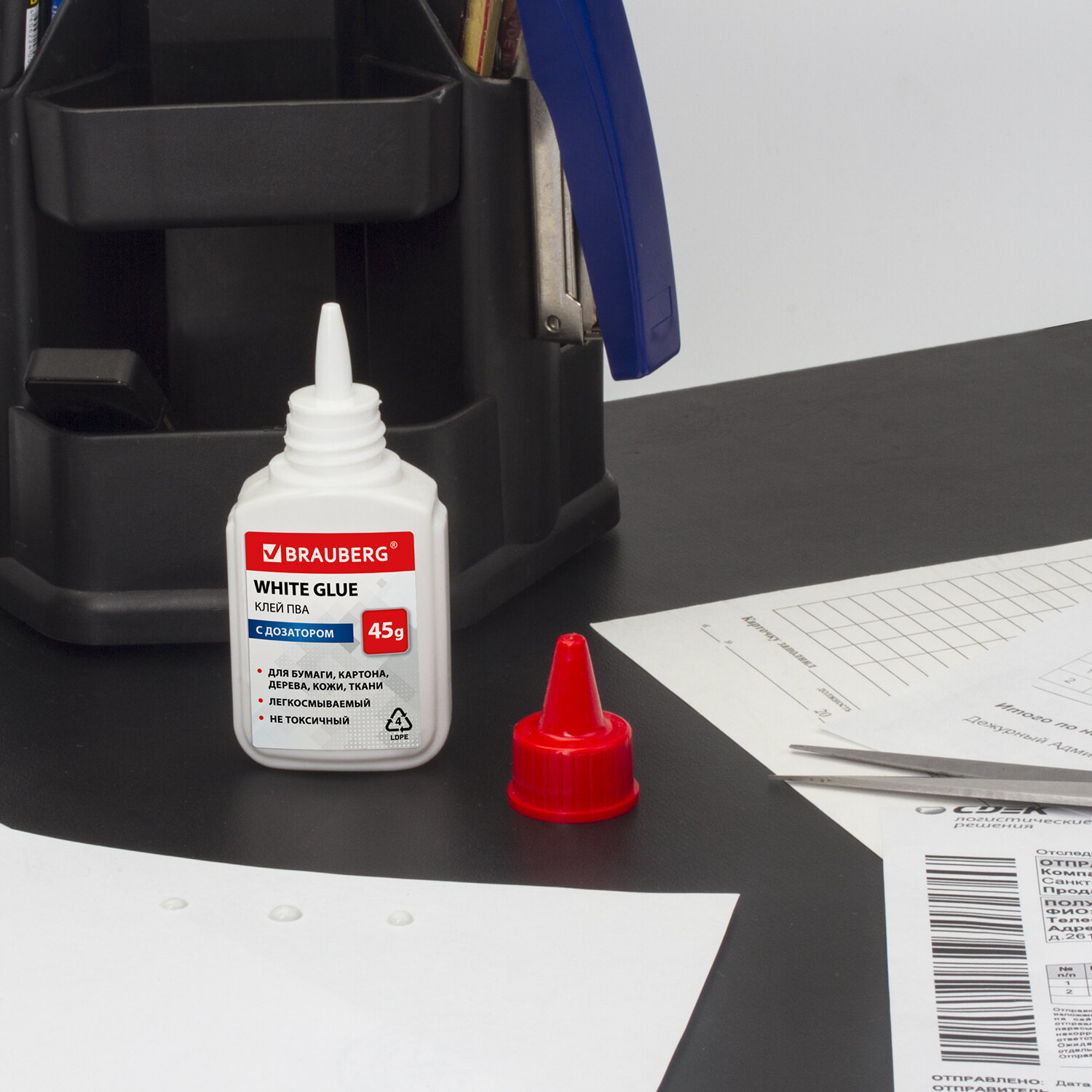 Пластиковый дозатор обеспечивает точное и равномерное нанесение. Обладает устойчивостью к морозу, не токсичен. Наносится тонким слоем, обеспечивая быстрое схватывание поверхностей, а также экономичное расходование. Съемный колпачок предохраняет клей от засыхания. Необходимо взболтать перед применением. Клей ПВА КОМПЛЕКТ 10 штук х 45 г (бумага, картон, дерево), ВЫГОДНАЯ УПАКОВКА, BRAUBERG, 270433, 93