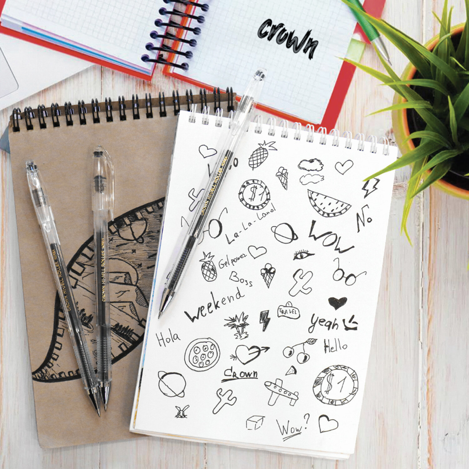 Стержень длиной 138 мм снабжен пишущим узлом 0,5 мм. Стандартный наконечник обеспечивает равномерный расход чернил и толщину линии письма 0,35 мм. Ручка гелевая CROWN "Hi-Jell", ЧЕРНАЯ, корпус прозрачный, узел 0,5 мм, линия письма 0,35 мм, HJR-500B