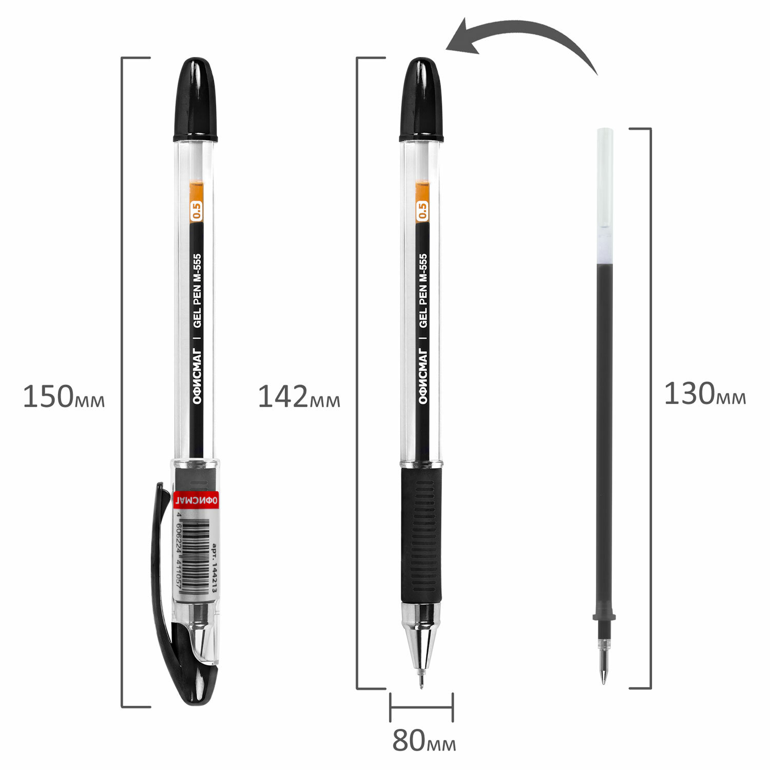 - Ручка гелевая с грипом ОФИСМАГ "M-555", ЧЕРНАЯ, игольчатый наконечник 0,5 мм, линия письма 0,35 мм, 144213
