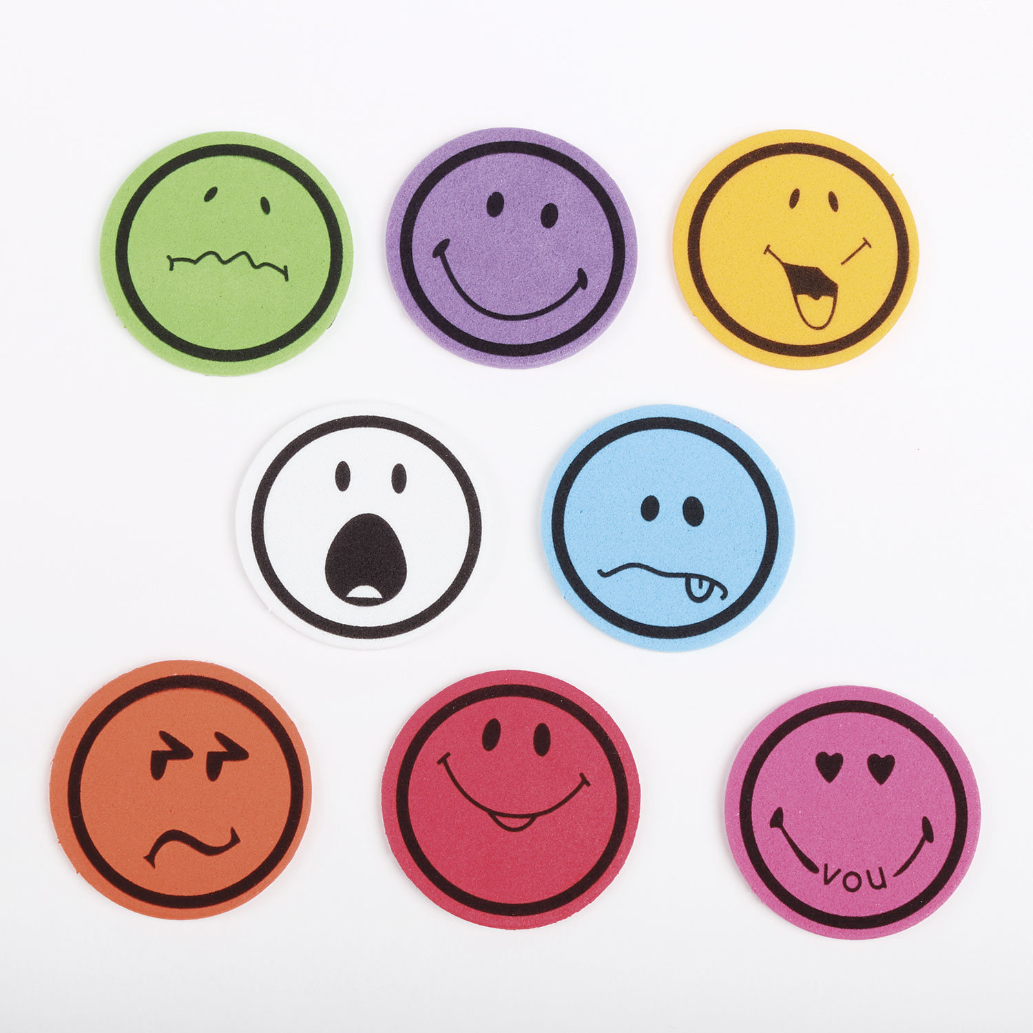 Изготовлены из фоамирана (EVA). В комплекте 60 красочных декоративных элементов в форме смайлов. Предназначены для детей от 3 лет. Размер 3х3 см. Поставляются в пакете с европодвесом. Качественный клеевой слой обеспечит надежную фиксацию на любых поверхностях.