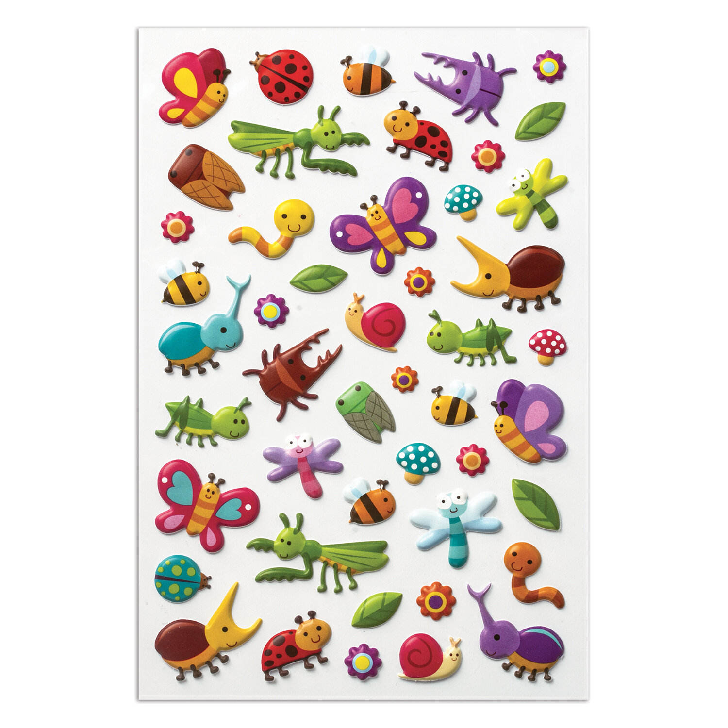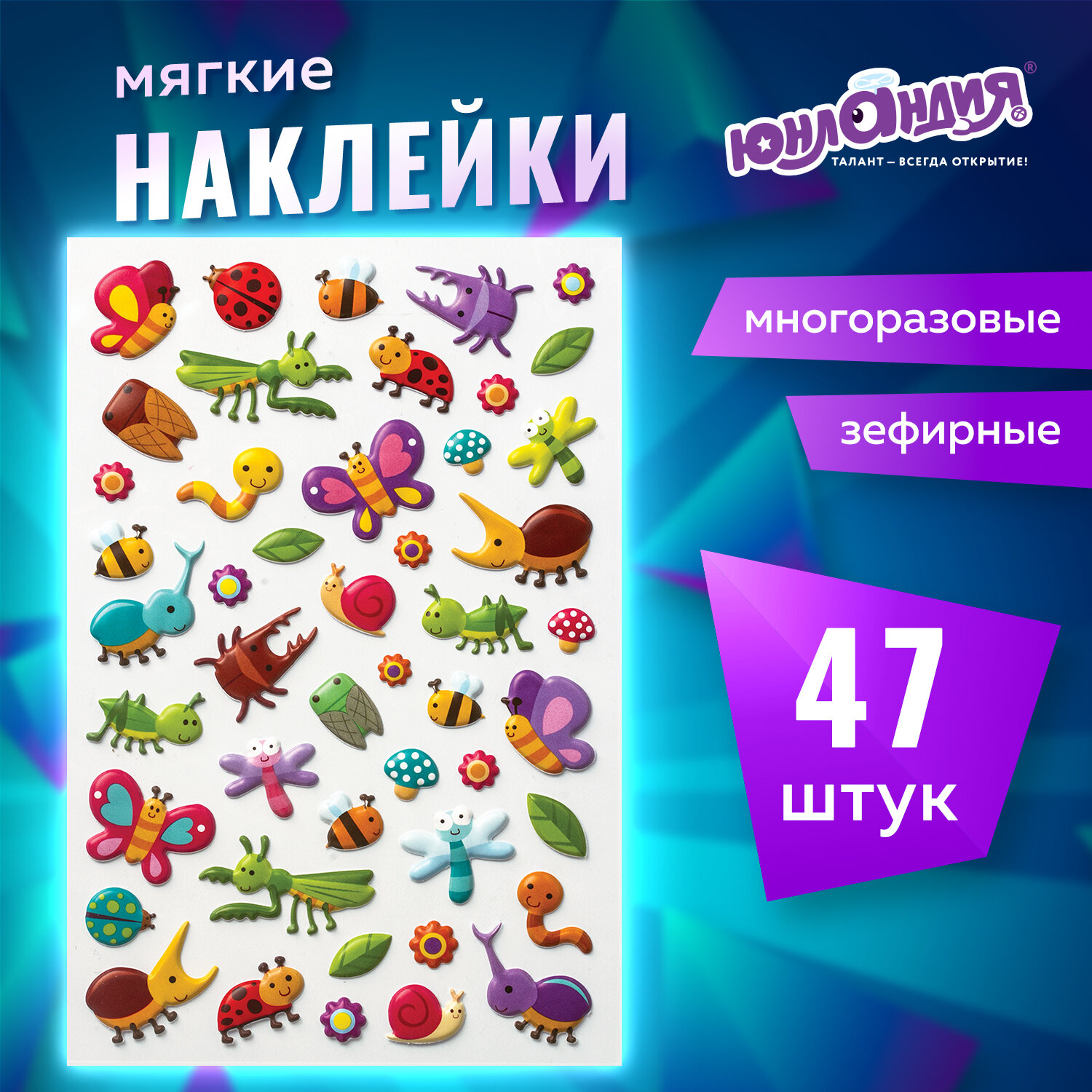 В наборе содержатся мягкие зефирные наклейки с изображением разных насекомых в количестве 47 штук. Наклейки отличаются высочайшим качеством печати и цветопередачи. Бабочки, стрекозы, жучки и другие букашки с удовольствием украсят тетради, дневники, гаджеты и любые поделки. Наклейки могут быть использованы и в обучающих целях.
