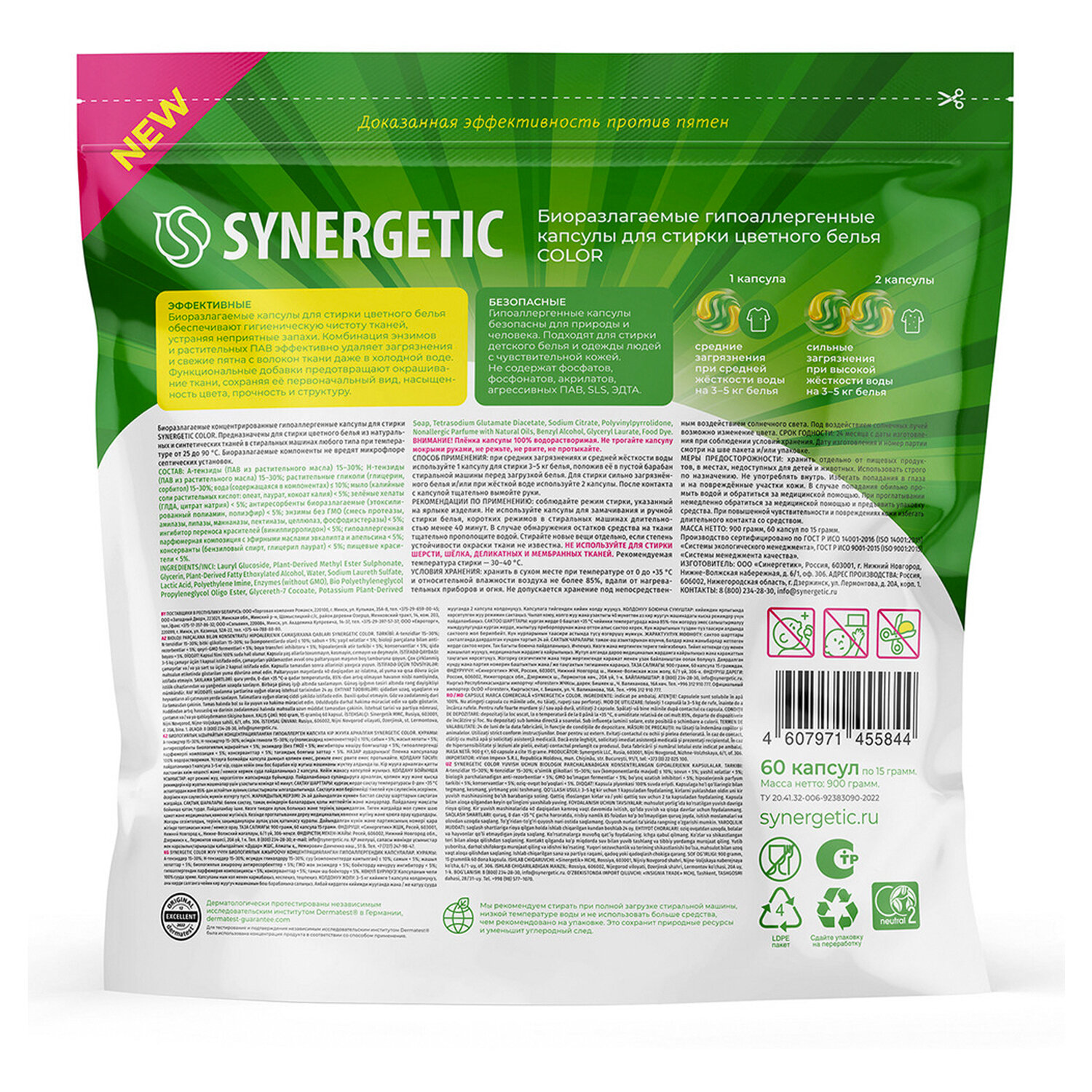 Биоразлагаемые гипоаллергенные капсулы для стирки SYNERGETIC COLOR обеспечивают гигиеническую чистоту, проникая глубоко в волокна ткани и расщепляя самые сложные загрязнения, препятствуют появлению катышков и ворсинок, а также устраняют неприятные запахи. Комбинация энзимов и растительных ПАВ эффективно удаляет загрязнения и свежие пятна с волокон ткани даже в холодной воде. Функциональные добавки предотвращают окрашивание ткани, сохраняя ее первоначальный вид, насыщенность цвета, прочность и структуру. Капсулы содержат гипоаллергенную отдушку с эфирными маслами эвкалипта и апельсина. Они подходят для стирки детского белья и одежды людей с чувствительной кожей. Предназначены для стирки цветного белья из натуральных и синтетических тканей в стиральных машинах любого типа при температуре от 25 °С до 90 °С. Средство не содержит фосфатов, фосфонатов, акрилатов, агрессивных ПАВ, SLS, ЭДТА. Капсулы дерматологически протестированы независимым институтом Dermatest® в Германии. Биоразлагаемые компоненты не вредят микрофлоре септических установок и водным организмам.
